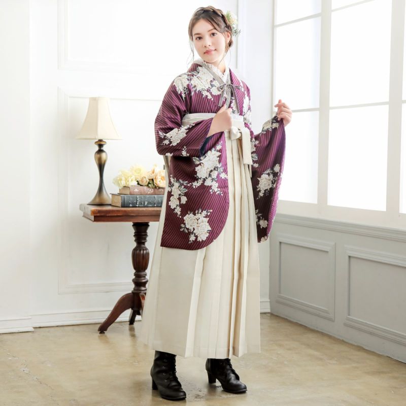 5. (卒業式応援75%SALE 2/19迄)袴 セット 卒業式 女性 4点セット「二尺袖:ストライプブーケプラム+袴:オフホワイト 葡萄+袴下帯:白 麻の葉+襦袢」卒業式 女性 レディース お仕立て上がり 袴セット 二尺袖着物セット 着物 二尺着物 袴【メール便不可】