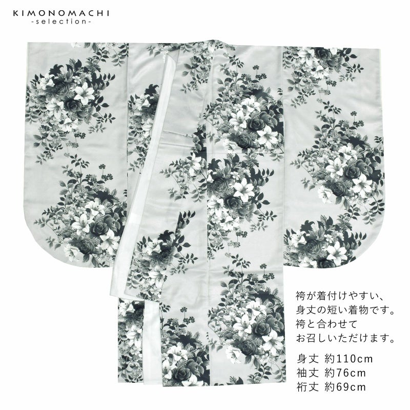 卒業式に 二尺袖袴セット 卒業式 袴 レディース 袴 セット 卒業式 女性 4点セット「二尺袖:ブーケ グレー+袴:黒+袴下帯:白 麻の葉+襦袢」卒業式 女性 レディース お仕立て上がり 袴セット 二尺袖着物セット 着物 二尺着物 袴【メール便不可】
