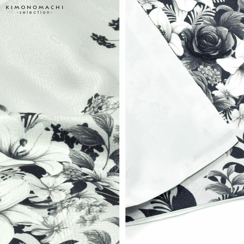 二尺袖着物:紗綾形に花の地模様の生地。明るいグレーの地に、深緑色や白、灰緑色、白緑色のバラや百合、小花に葉のブーケ。灰緑の影や、濃い緑色のシルエットが奥行きを添えています。