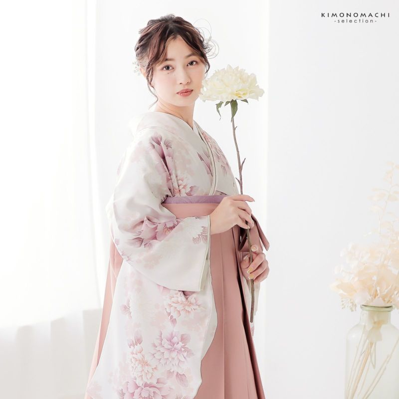 袴 セット 卒業式 女性 4点セット「二尺袖:牡丹に菊 パールピンク+袴:スモーキーピンク 南天+袴下帯:ダルパープル 麻の葉+襦袢」卒業式 女性 レディース お仕立て上がり 袴セット 二尺袖着物セット 着物 二尺着物 袴