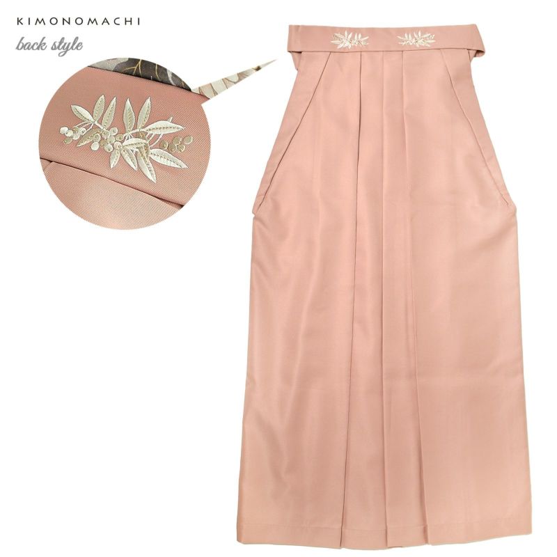 二尺袖着物は袴と合わせて着付けやすい短丈タイプです。袴はバックスタイルに刺繍のワンポイント。行灯袴(あんどんはかま)で中仕切りのないスカートタイプ。