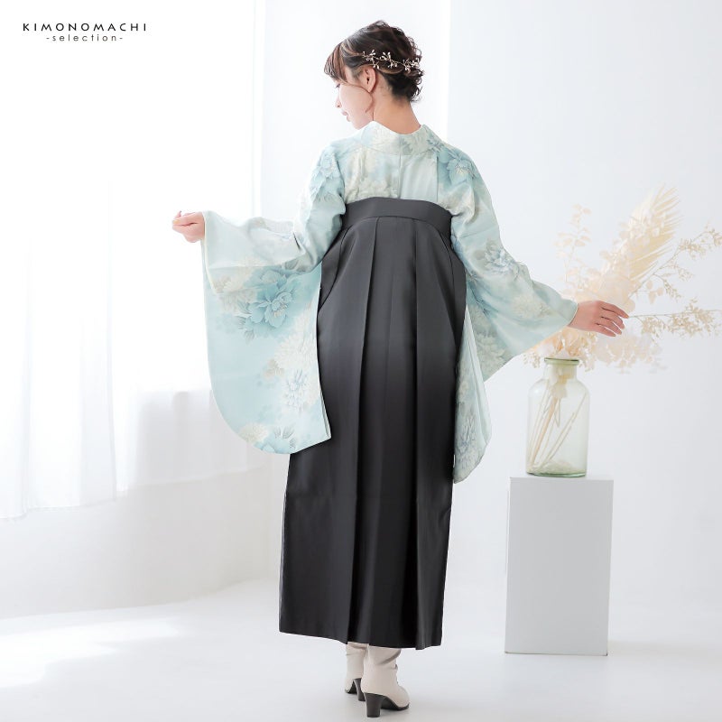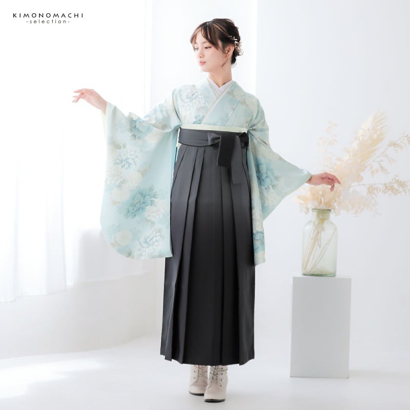 袴 セット 卒業式 女性 4点セット「二尺袖:牡丹に菊 ベビーブルー+袴:黒色ぼかし+袴下帯:ブラック 麻の葉+襦袢」卒業式 女性 レディース お仕立て上がり 袴セット 二尺袖着物セット 着物 二尺着物 袴