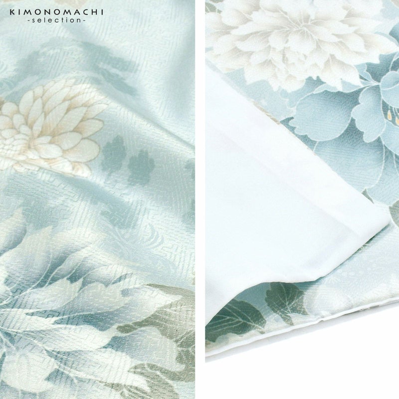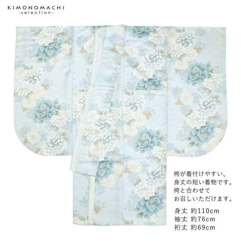 二尺袖着物:紗綾形に花の地模様の生地。ややグレイッシュな淡い水色の地に、淡いターコイズやブルーグレー、アイスグレーの牡丹、白にグレージュぼかしの菊の花。スモークブルーのシルエット。