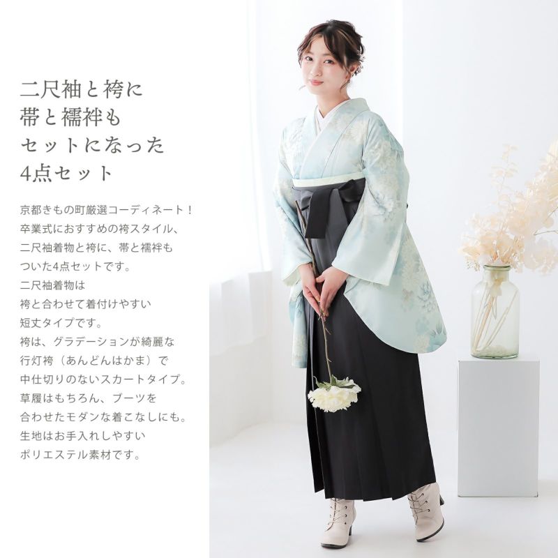 卒業式に 二尺袖袴セット 卒業式 袴 レディース 袴 セット 卒業式 女性 4点セット「二尺袖:牡丹に菊 ベビーブルー+袴:黒色ぼかし+袴下帯:ブラック 麻の葉+襦袢」卒業式 女性 レディース お仕立て上がり 袴セット 二尺袖着物セット 着物 二尺着物 袴【メール便不可】