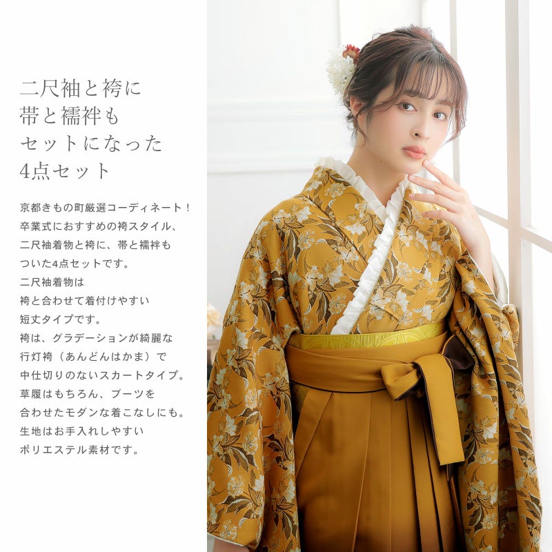 京都きもの町厳選コーディネート!卒業式におすすめの袴スタイル、二尺袖着物と袴に、帯と襦袢もついた4点セットです。