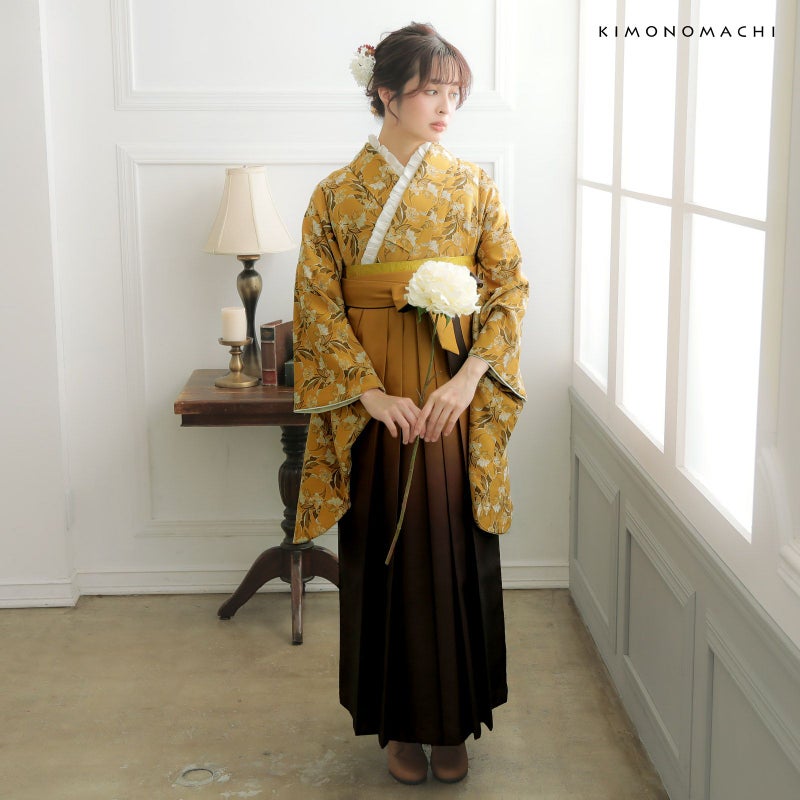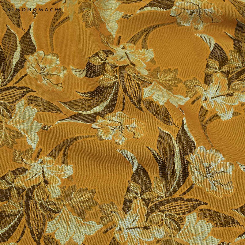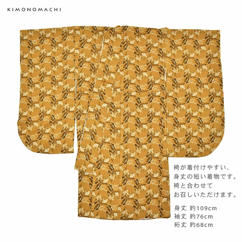 二尺袖着物:黄土色を基調とした花柄のお着物。ジャガード織りのため柄が立体的に浮かび上がり、葉も見る角度によって光沢感が出て、高級感のある風合いとなっています。