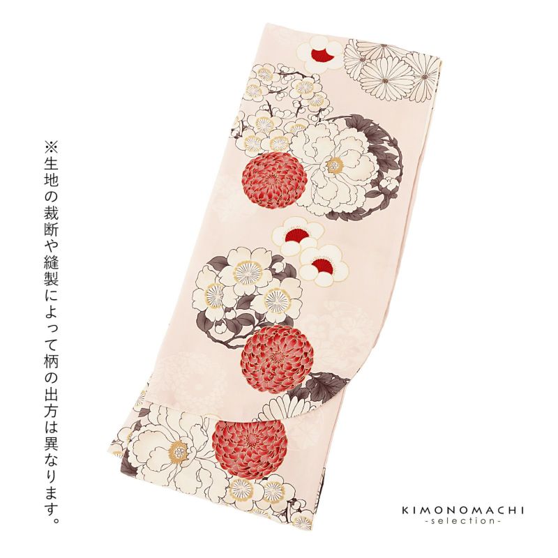 二尺袖着物:淡いくすみピンクにアイボリー、淡いベージュ、グレー、浅いピンクみの赤紫、深い赤の配色の丸く表現された大きな牡丹の花や菊、梅や桜。蕊などに黄色。アイボリーの花の丸が奥行きを添えています。輪郭やポイントに金彩。