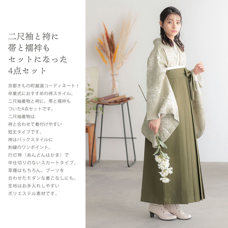 京都きもの町厳選コーディネート!卒業式におすすめのスタイル、二尺袖着物と袴に、帯と襦袢もついた4点セットです。