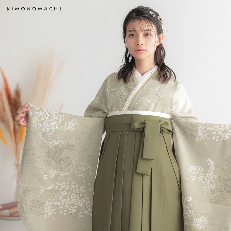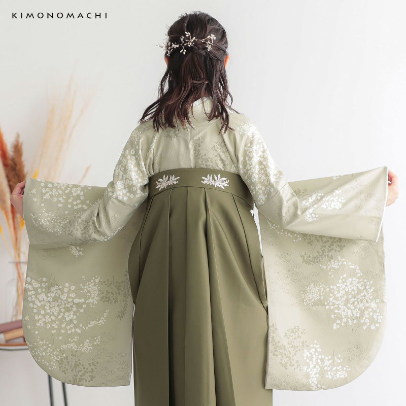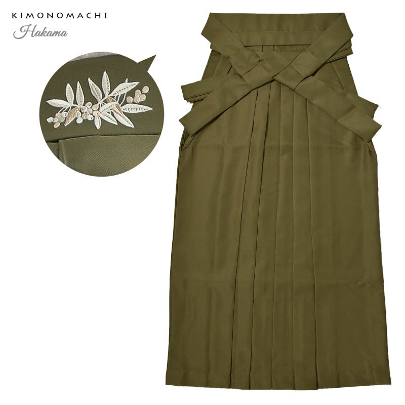 袴:灰みの黄緑色系のオリーブ色の地、腰の後ろ部分にシルバーグレーやグレージュ、ポイントに金糸の入った南天の刺繍。
