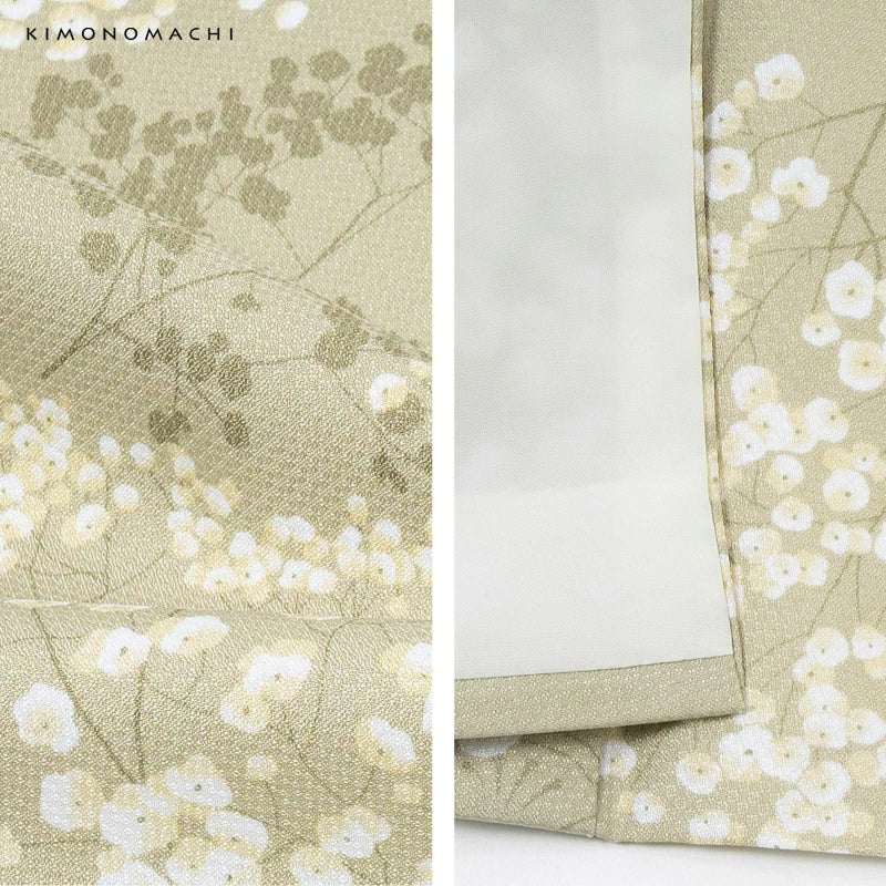 二尺袖着物:浅い緑みのベージュの地に灰黄緑色の破れ青海波が表現されています。白い花に灰黄緑の茎のカスミソウに灰黄緑のシルエットを添えたデザイン。落ち着いた優しい色合いが大人の可愛らしさを感じさせます。裏はオフホワイト。