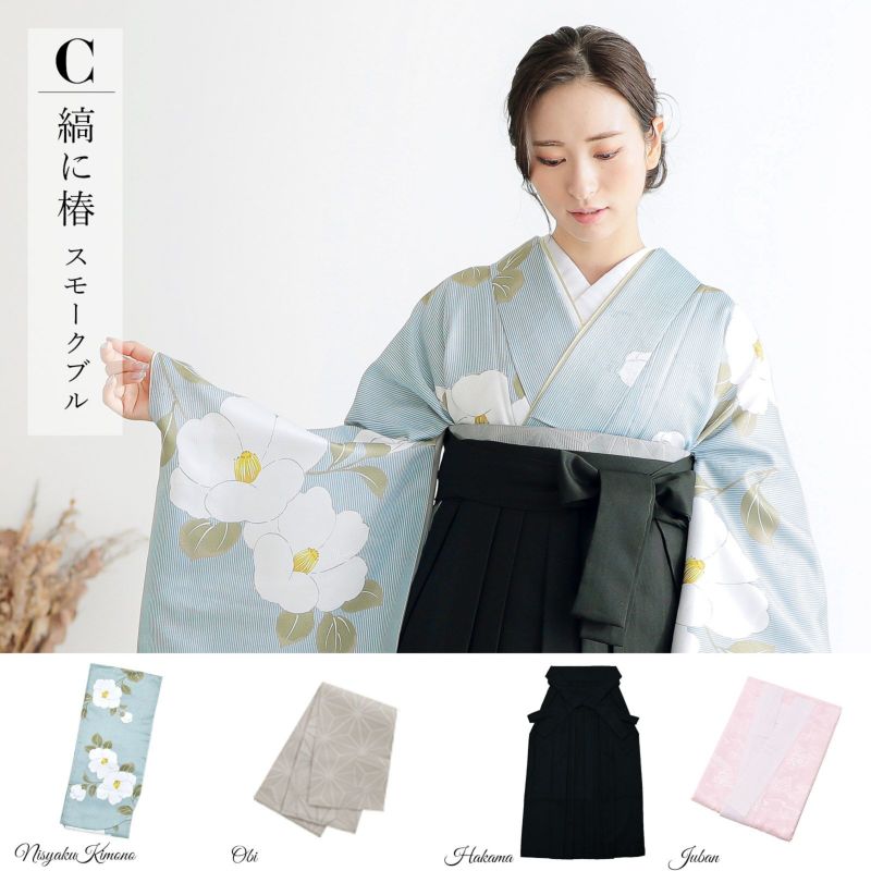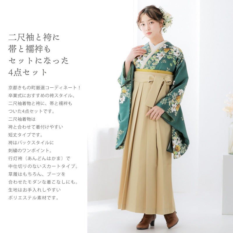 京都きもの町厳選コーディネート!卒業式におすすめの袴スタイル、二尺袖着物と袴に、帯と補袢もついた4点セットです。