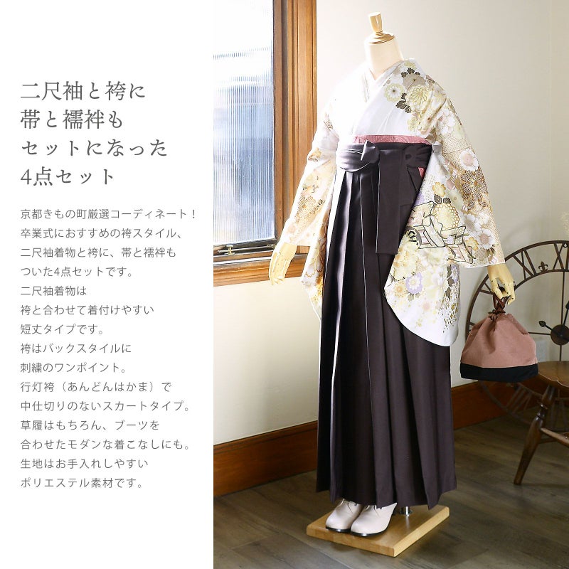 京都きもの町厳選コーディネート! 卒業式におすすめの袴スタイル、 二尺袖着物と袴に、 帯と襦袢もついた4点セットです。