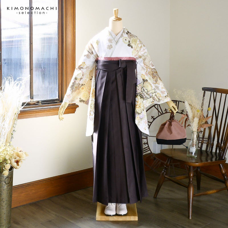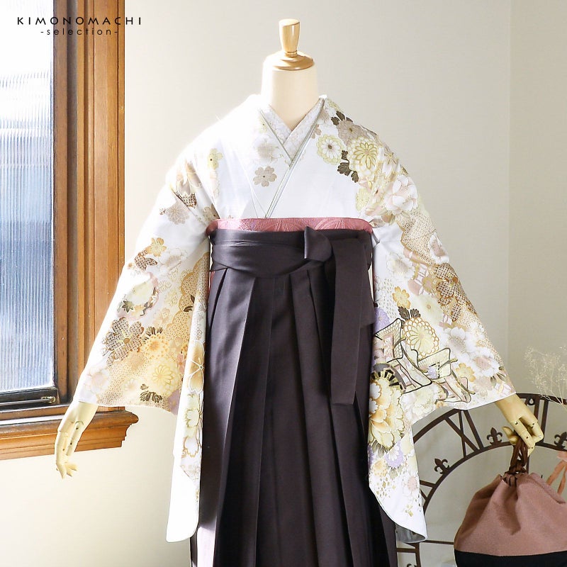 卒業式に 二尺袖袴セット 卒業式 袴 レディース 袴 セット 卒業式 女性 4点セット「絵羽二尺袖:白地 雲取りに四季花、御所車+刺繍袴:アンティークブラウン+袴下帯:ロータスピンク+襦袢」卒業式 女性 レディース お仕立て上がり 袴セット 二尺袖着物セット 着物 二尺着物 袴【メール便不可】