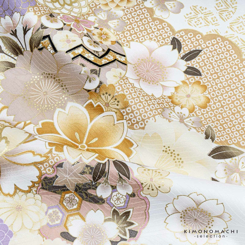 二尺袖着物:波の地模様のある白地。ベージュやピンクベージュの雲取りに鹿の子や七宝など。御所車に鞠、その上に淡いピンクやクリーム色、金茶色、グレージュ、藤色などの牡丹や菊、八重桜などの花々が表現され、さらに金彩が煌びやかさを添えます。文様が縫い目をまたいで繋がる絵羽になっています。