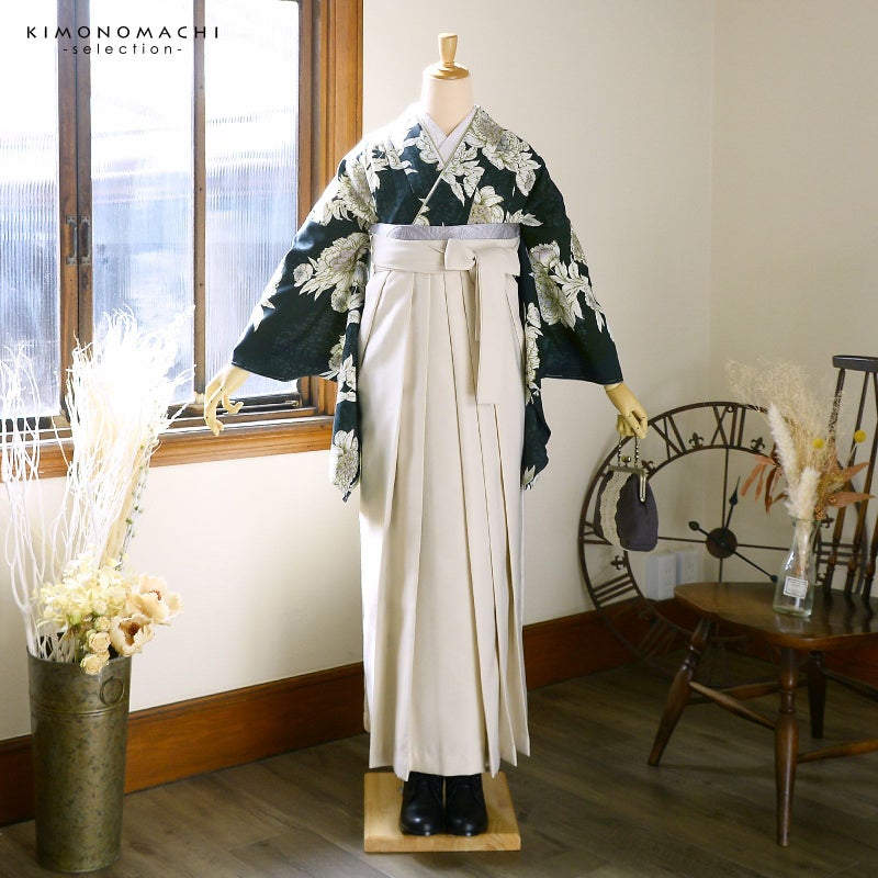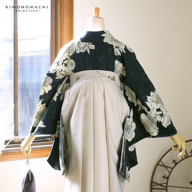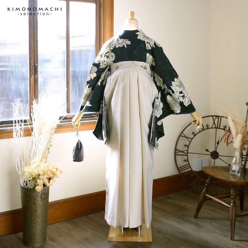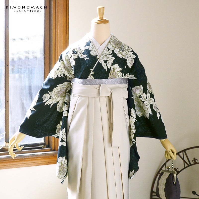 5. (卒業式応援Point10倍 3/5迄)袴 セット 卒業式 女性 4点セット「二尺袖:牡丹 黒緑+刺繍袴:オフホワイト+袴下帯:シルバーグレー+襦袢」卒業式 女性 レディース お仕立て上がり 袴セット 二尺袖着物セット 着物 二尺着物 袴【メール便不可】