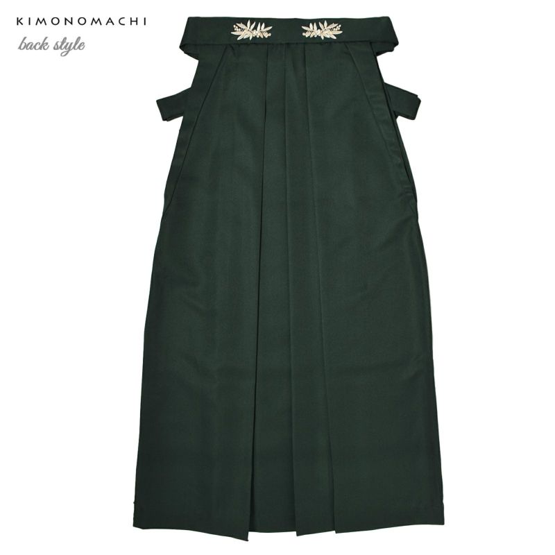 袴:やや暗い深緑色の地、腰の後ろ部分にシルバーグレーやグレージュ、ポイントに金糸の入った南天の刺繍。