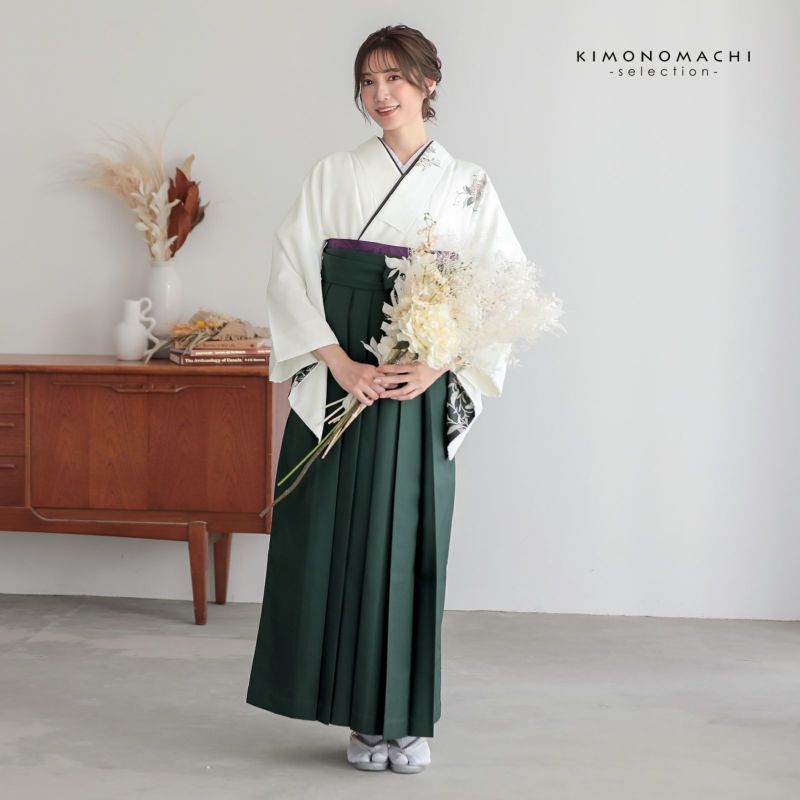 先生袴 セット 4点セット「訪問着:白 唐花+袴:ダークグリーン 南天+袴下帯:グレープ 麻の葉+襦袢」卒業式 女性 レディース お仕立て上がり 袴セット 訪問着セット 着物 訪問着 袴 先生【メール便不可】