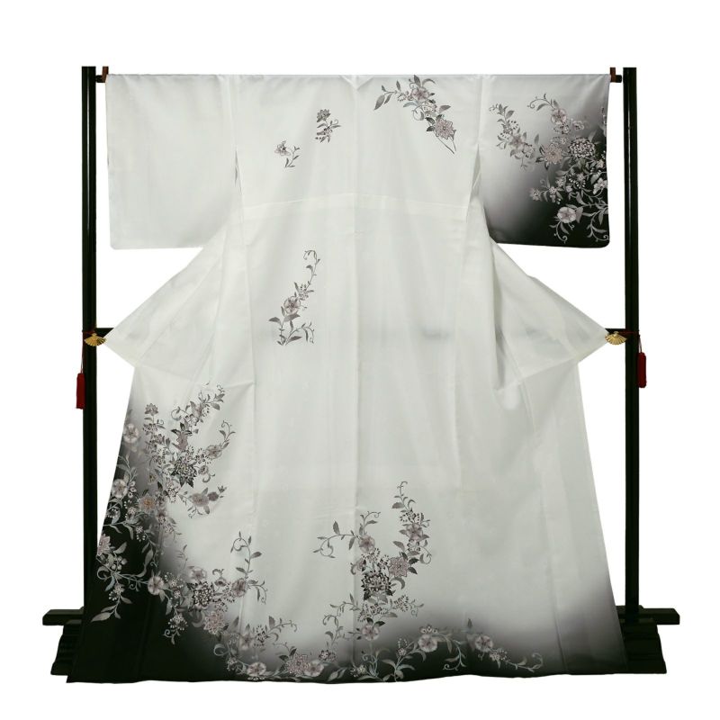 訪問着:小桜の地模様のある白地に鉄黒色の裾ぼかし。浅い利休色にベージュ、チャコールの蔓草を伸ばした淡い灰桜色や梅鼠色の唐花文様。ポイントに玉虫色のラメ糸刺繍。八掛はオフホワイト。