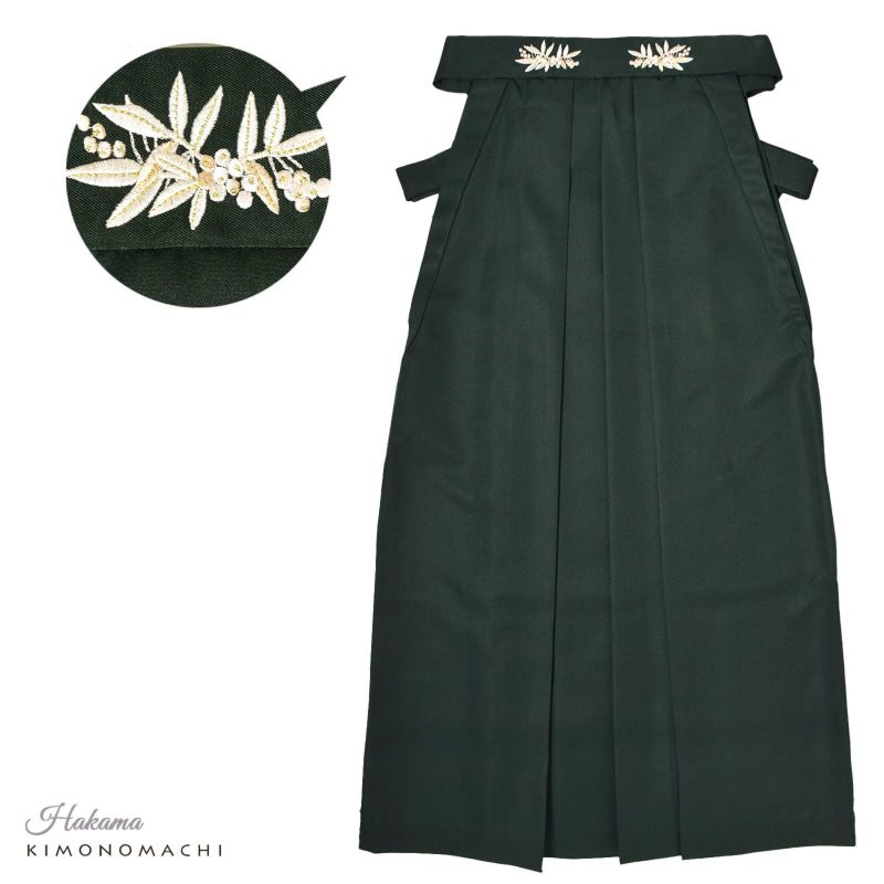 袴:やや暗い深緑色の地、腰の後ろ部分にシルバーグレーやグレージュ、ポイントに金糸の入った南天の刺繍。
