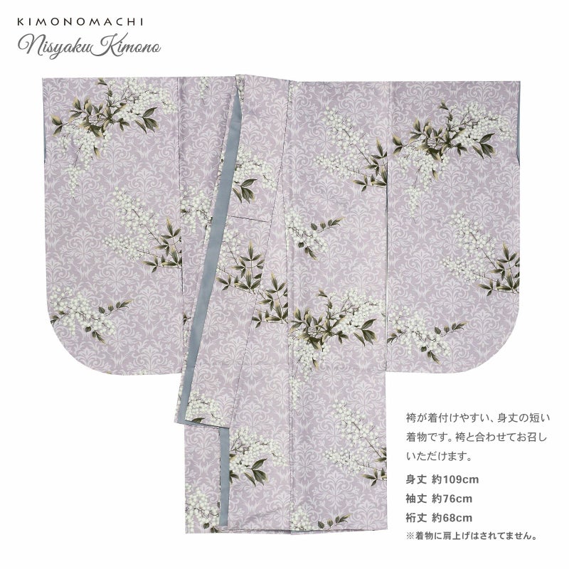 二尺袖着物:藤色の地に淡いパープルグレーのアラベスク文様、その上に白南天が表現されています。月白色の実に煤竹色の枝葉、ベージュのぼかしが立体感を演出。和風と異国風、両方の魅力が調和したデザインです。裏地は薄鈍色。