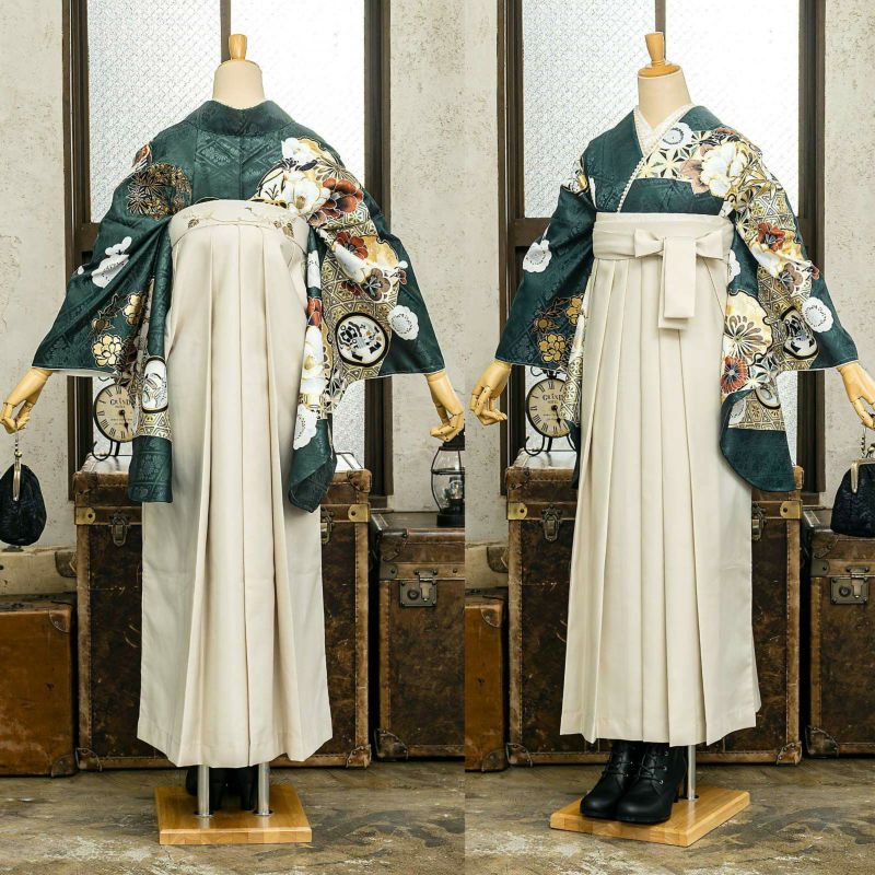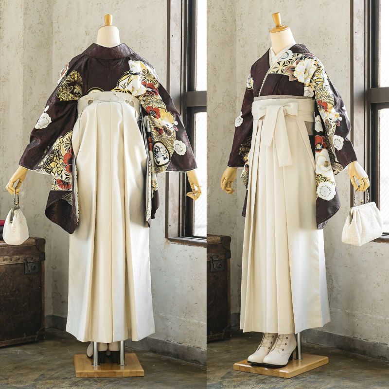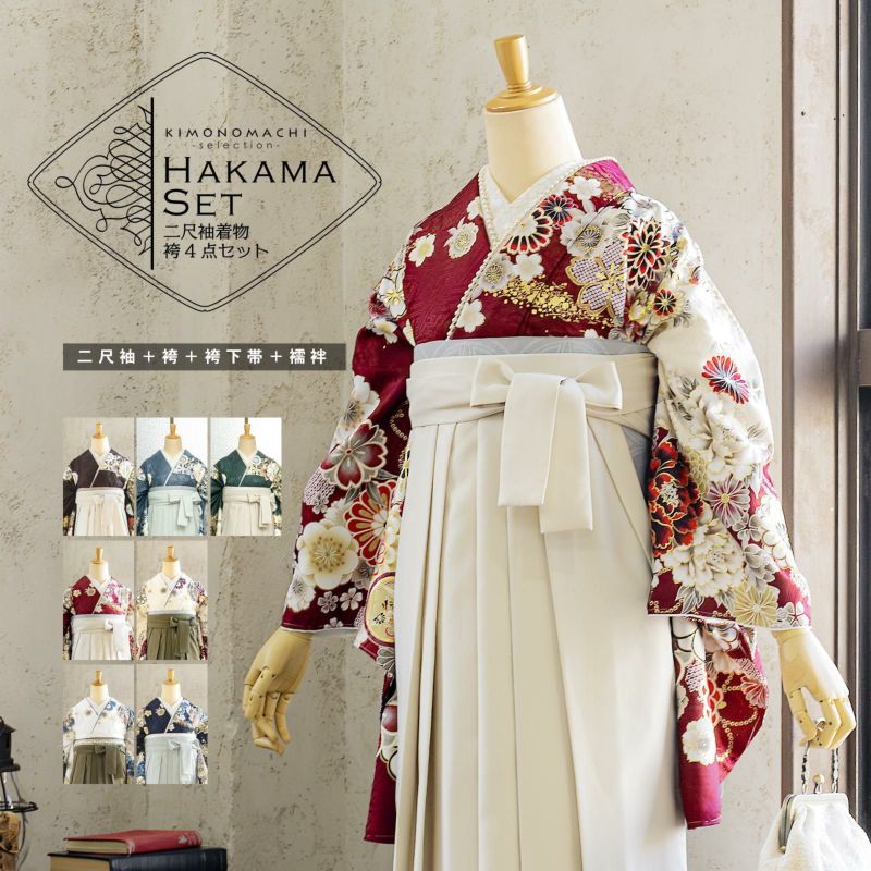 京都きもの町厳選コーディネート! 卒業式におすすめの袴スタイル、 二尺袖着物と袴に、 帯と襦袢もついた4点セットです。