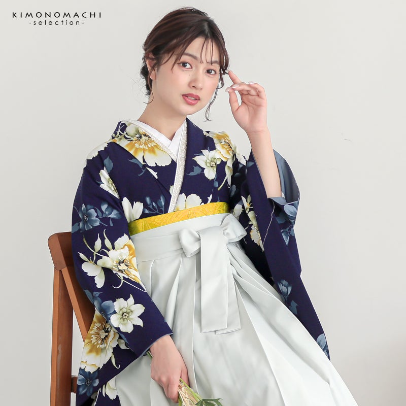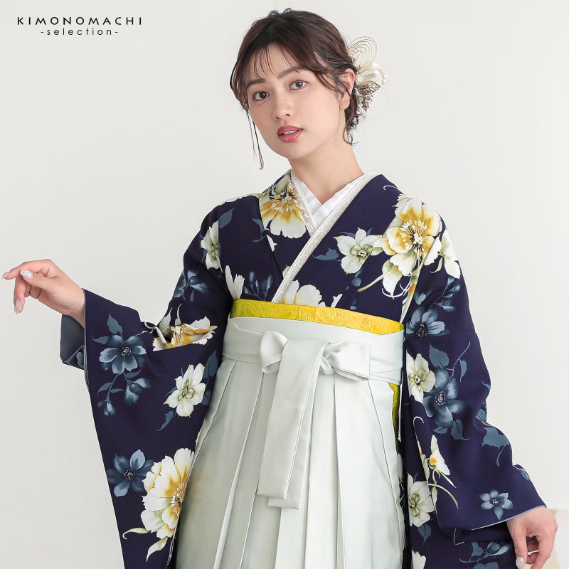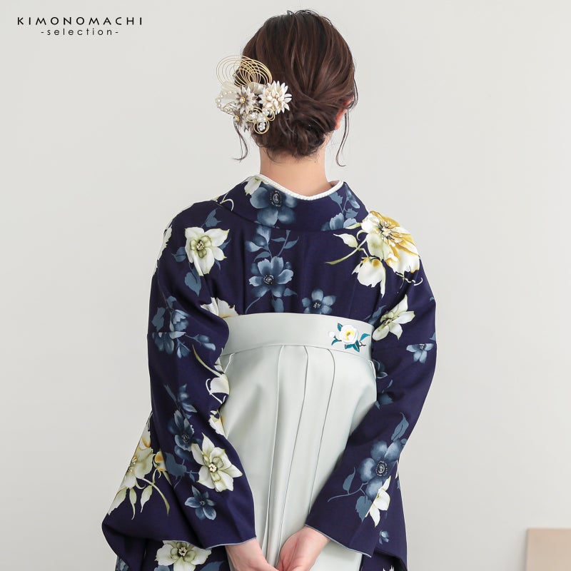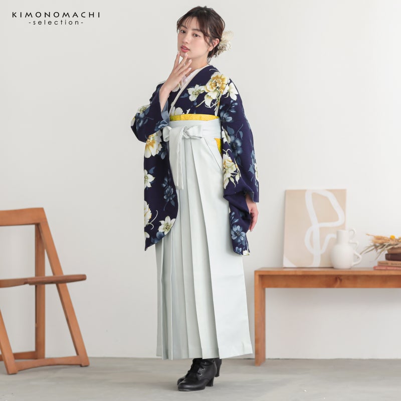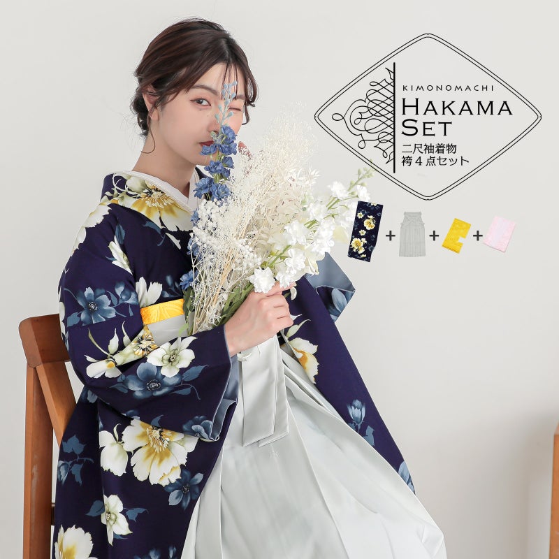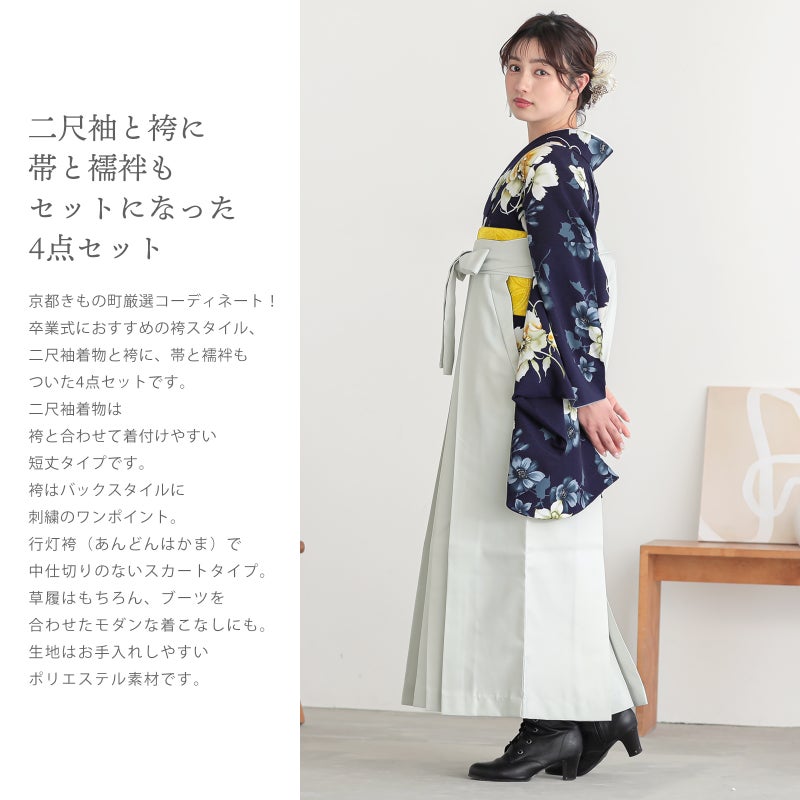 京都きもの町厳選コーディネート! 卒業式におすすめの袴スタイル、 二尺袖着物と袴に、 帯と襦袢もついた4点セットです。