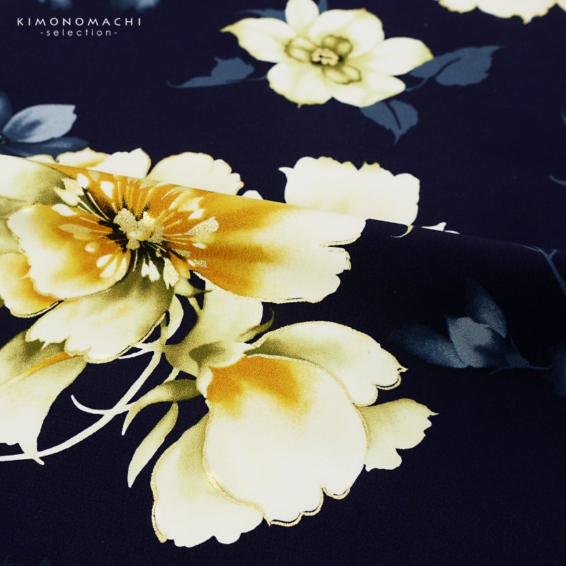 二尺袖着物:鮮やかな紺青の地に、オフホワイト、金茶色に淡い灰緑のぼかしの配色で表現されたポピー風の大きなお花にカトレアのようなお花、浅いブルーの花のシルエットが散らされています。ポイントに金彩。