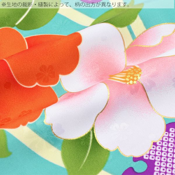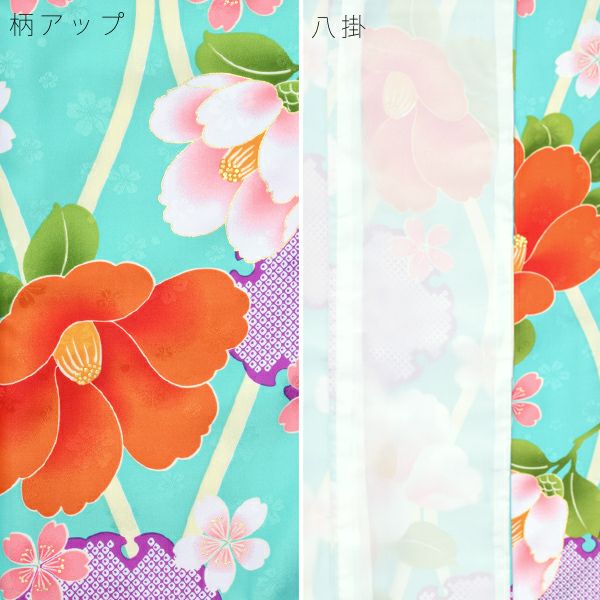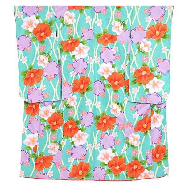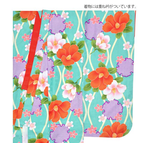 (卒業式応援75%SALE 3/5迄)【Prices down2】ジュニア二尺袖単品「ターコイズ 立涌に雪輪、椿」襦袢付き 二尺袖 卒業式 12歳、13歳 ジュニア着物 (KKJ-22)【メール便不可】<H>ss2512kkd15