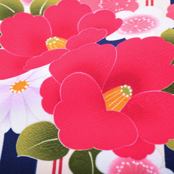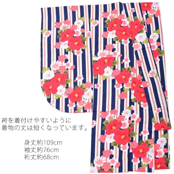 (卒業式応援75%SALE 3/5迄)二尺袖着物単品「紺色×赤 縞につばき、梅」フリーサイズ 二尺袖着物 ポリエステル着物 華やか 二尺袖 (8FN-122)【メール便不可】<H>ss2512kck10