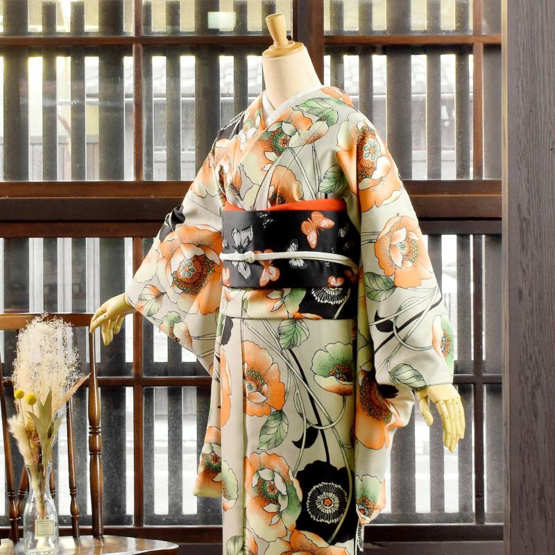 細かな地模様のある生地です。ベージュみの淡い灰黄緑色の地に、黒の輪郭線で大きく描かれたポピーの柄。薄黄色に濃淡のあるオレンジの花、浅緑色の蕊。黒のシルエットのポピーが全体を引き締めます。ぼかしの色の変化が美しく、アールヌーヴォー調の黒の曲線や点描の表現が、艶めかしい雰囲気も感じさせます。裏地は軽い灰緑色。
