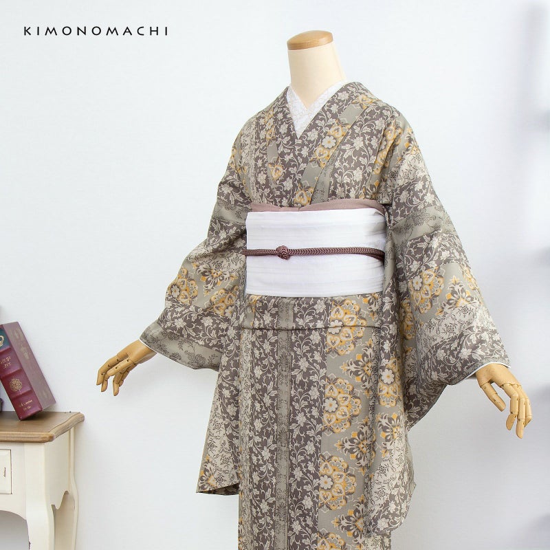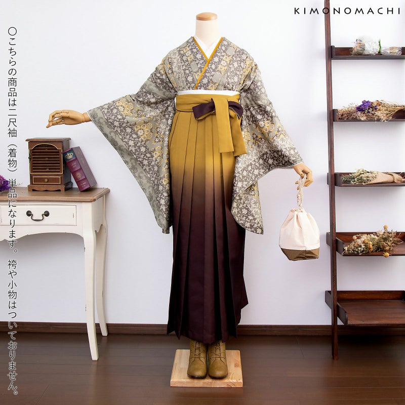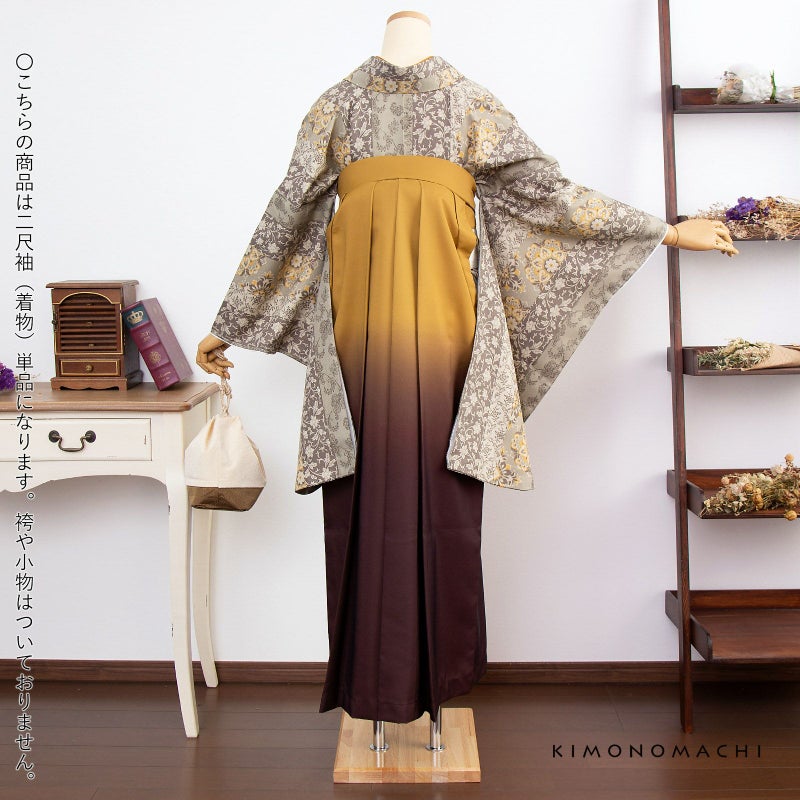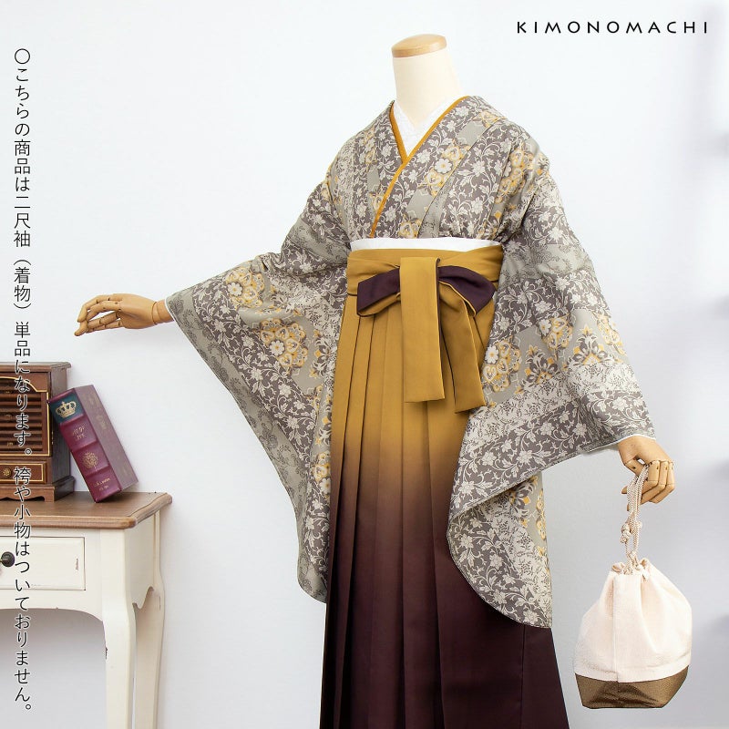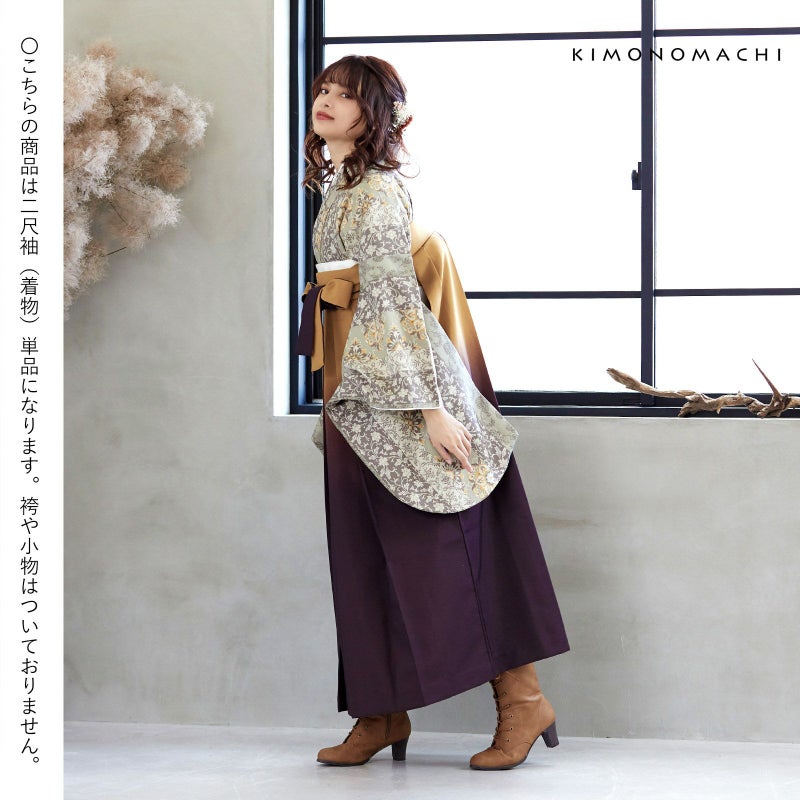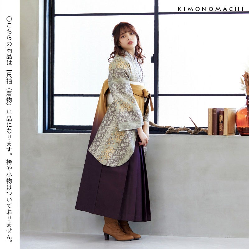 京都きもの町オリジナルブランド「KIMONOMACHI」の二尺袖着物単品です。袴と合わせて卒業式などの袴スタイルに。また身丈が通常の着物と同様の長さがございますので、袴無しで、袖が長めなアンティーク風着物としてもお召しいただけます。