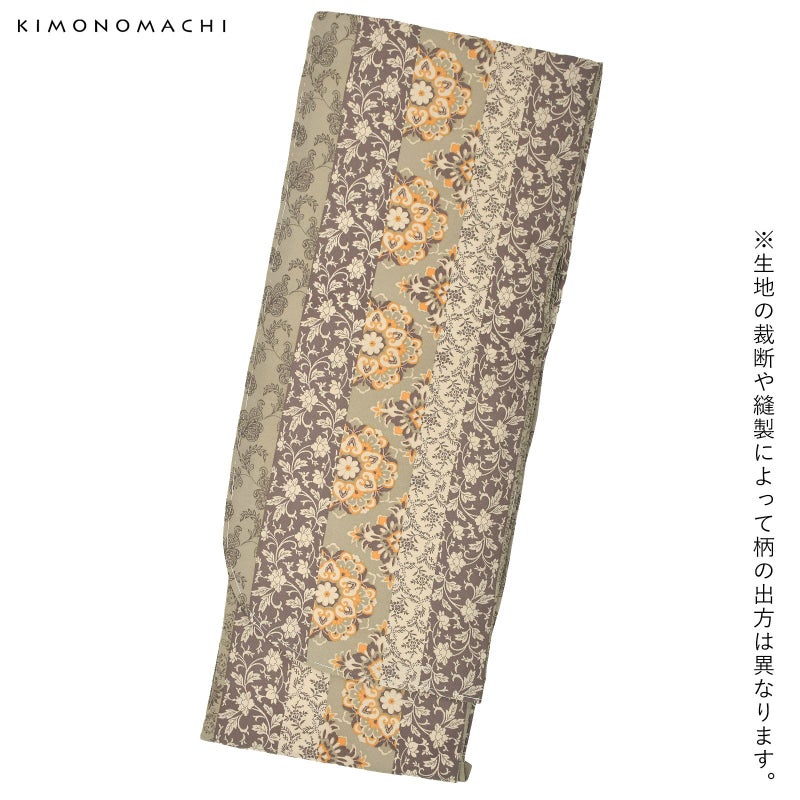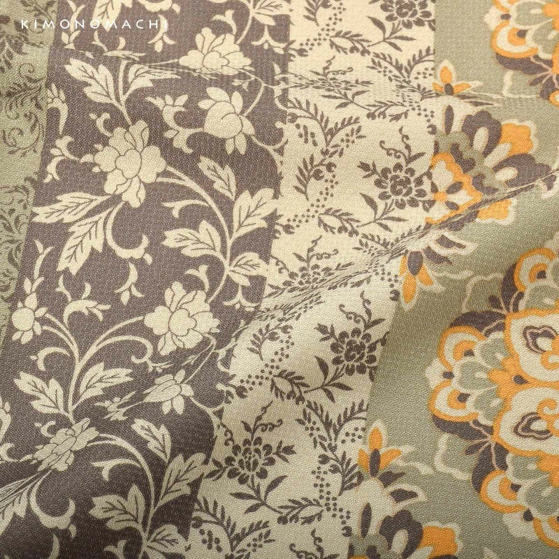 細かな地模様のある生地。全体的にグレイッシュな色合いのカーキ、ベージュ、薄茶色の縦縞。その中に浅い山吹色の挿し色が入った大きな華紋や、桃唐草、ペイズリー風の草花など様々な唐草文様。落ち着いた色合いの中に、オリエンタルな魅力溢れるデザインです。裏地は白。