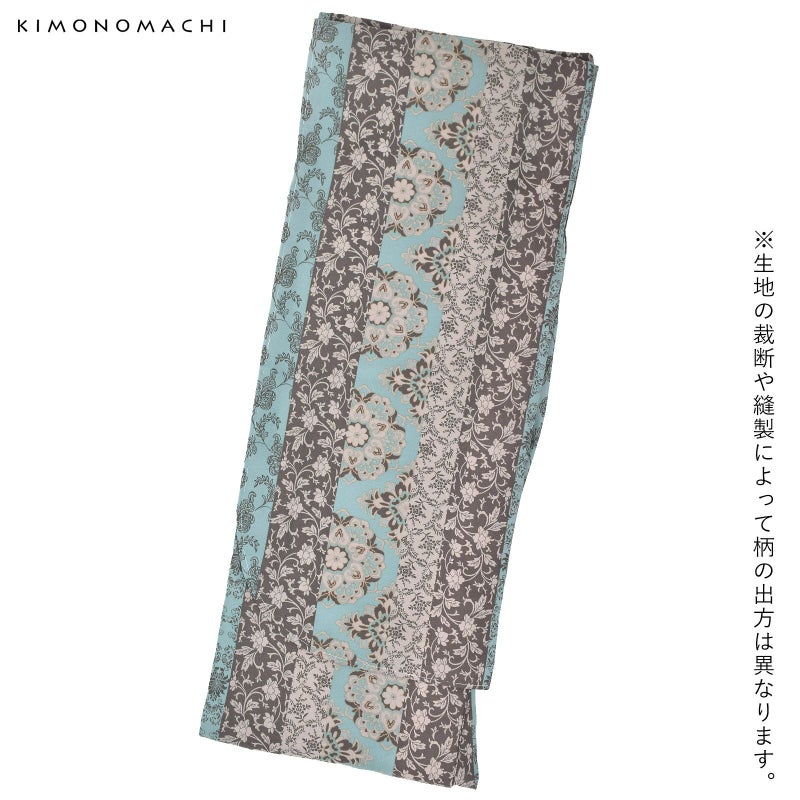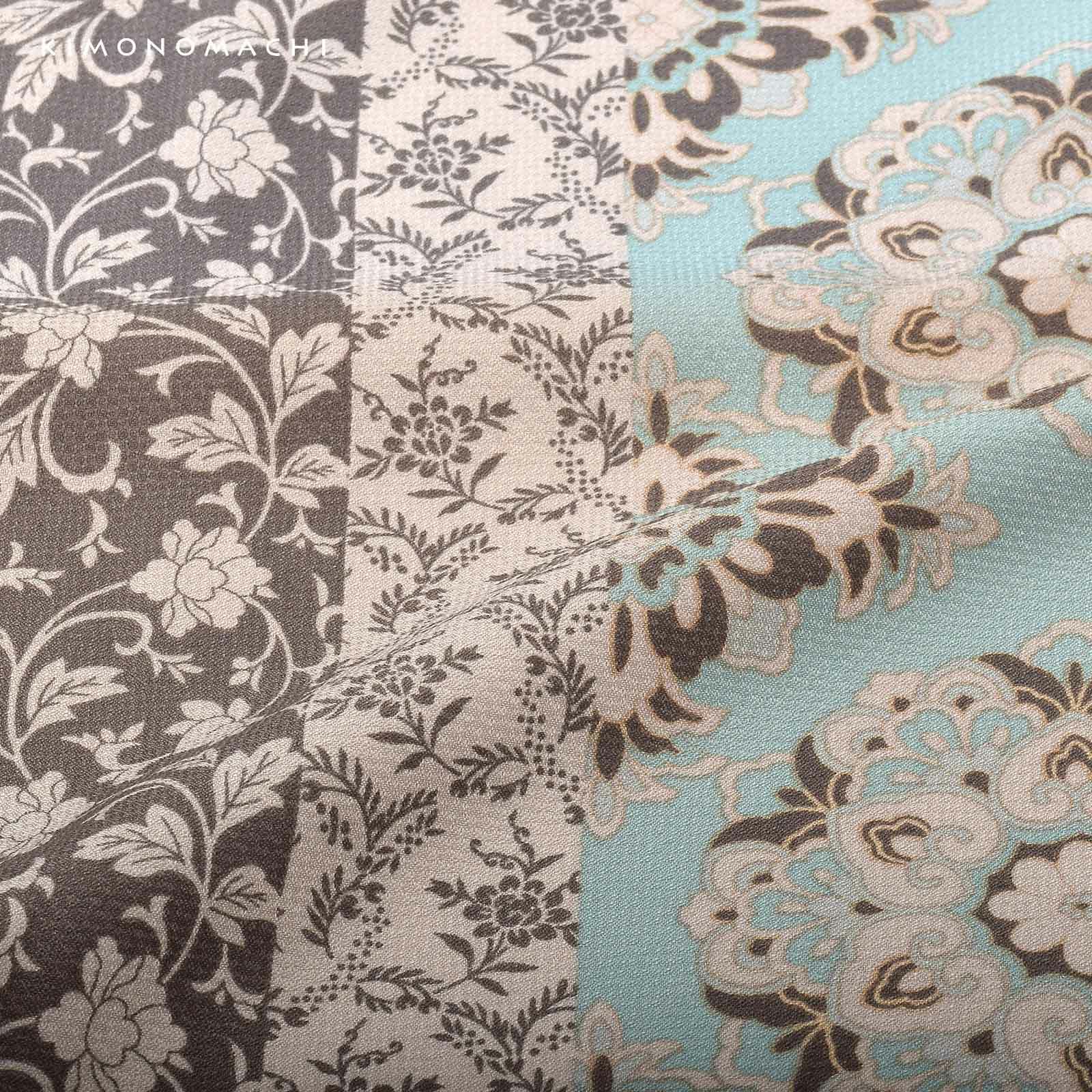 細かな地模様のある生地。全体的にグレイッシュな色合いの浅い水色、ベージュ、薄茶色の縦縞。その中にやや鮮やかな水色、薄水色の挿し色が入った大きな華紋や、桃唐草、ペイズリー風の草花など様々な唐草文様。ミントチョコのような現代的な色使いとオリエンタルな文様がお洒落なデザインです。裏地は白。