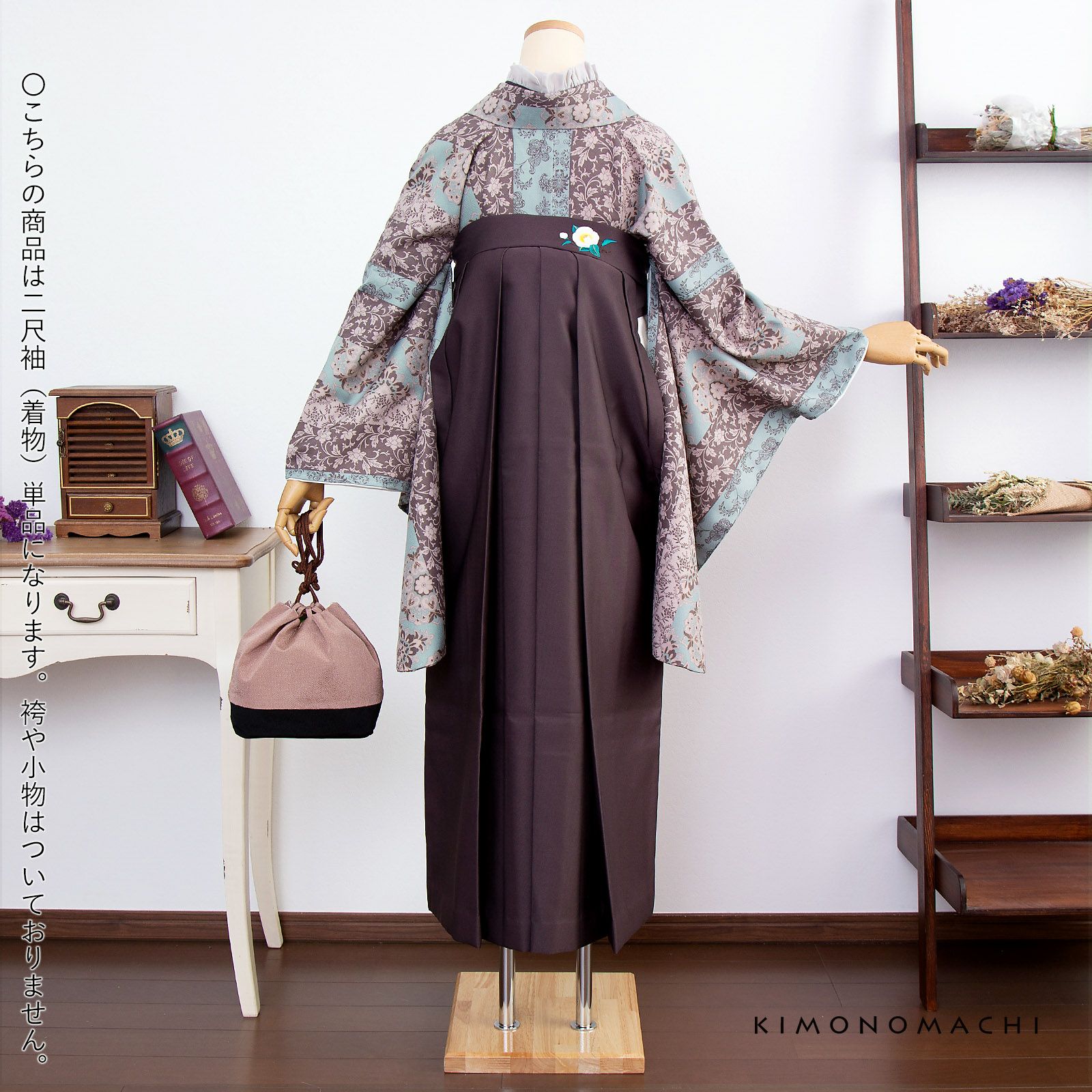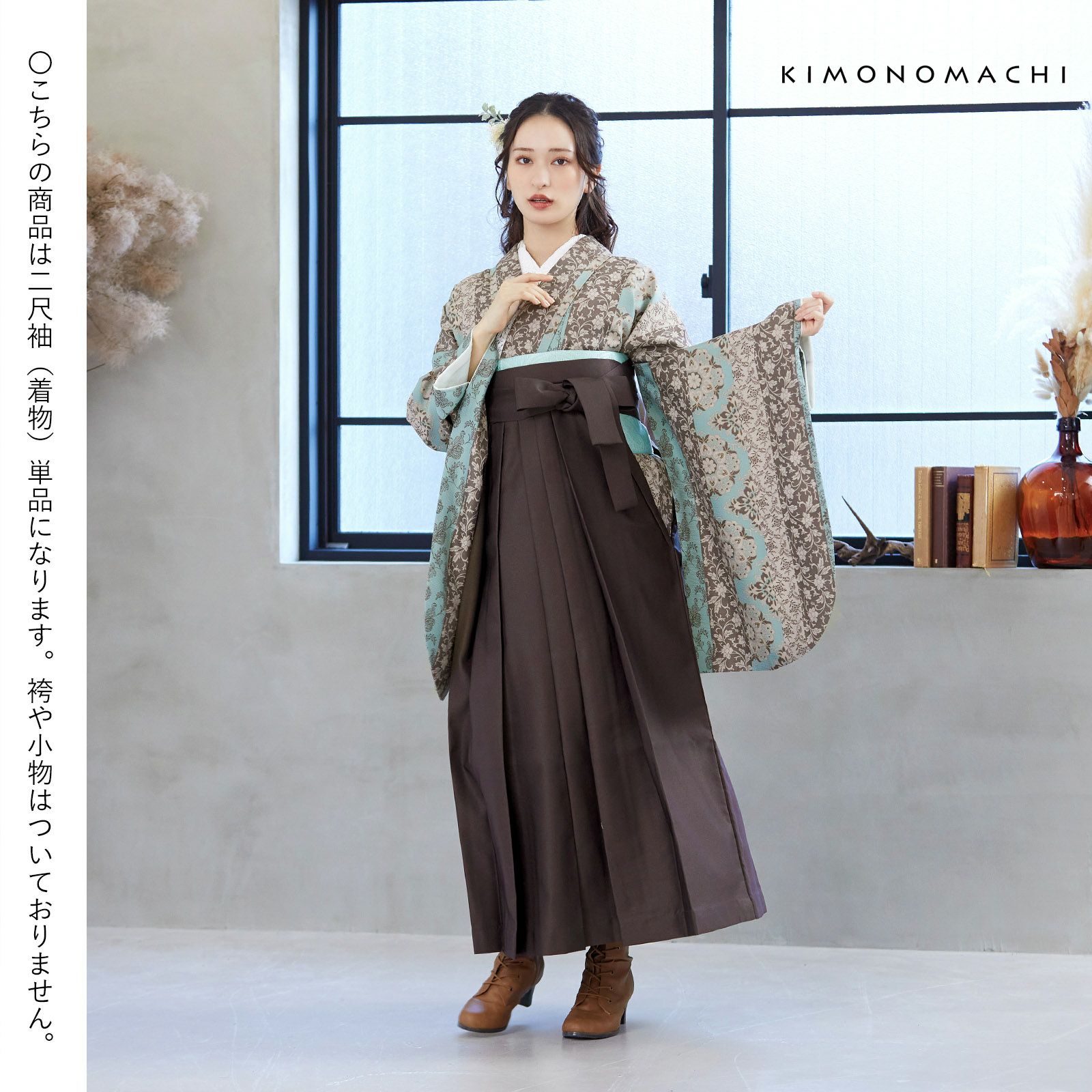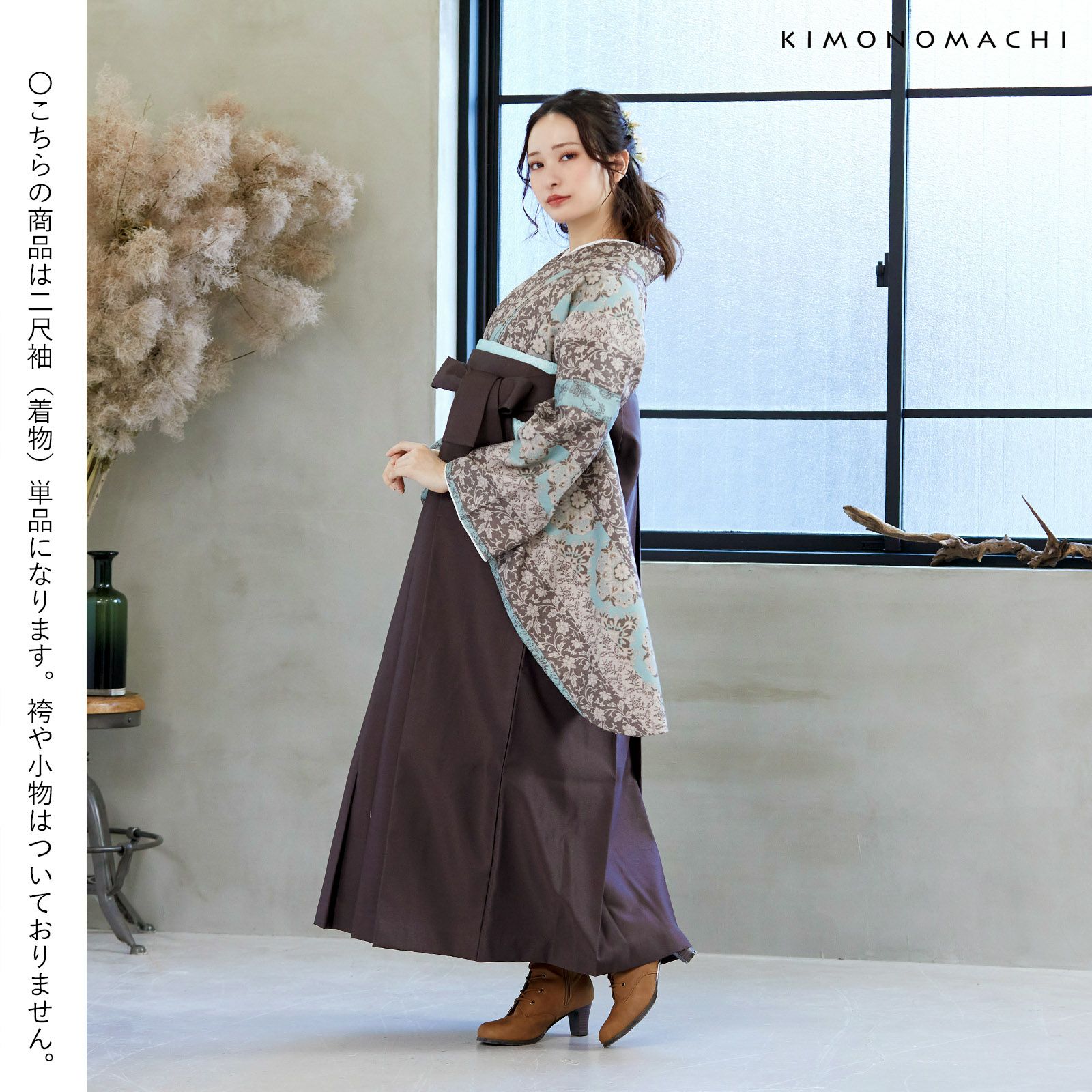 京都きもの町オリジナルブランド「KIMONOMACHI」の二尺袖着物単品です。袴と合わせて卒業式などの袴スタイルに。また身丈が通常の着物と同様の長さがございますので、袴無しで、袖が長めなアンティーク風着物としてもお召しいただけます。