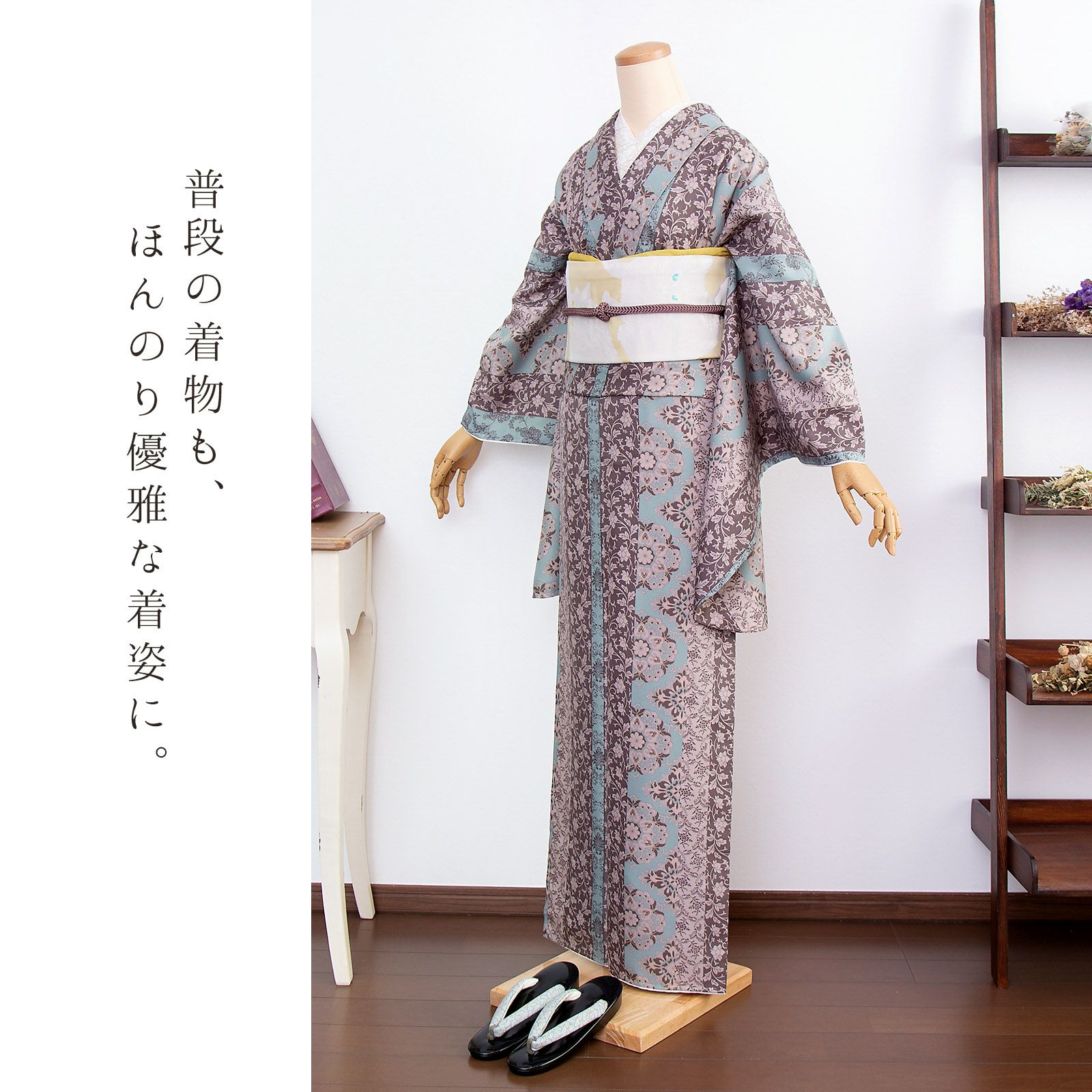 袴と合わせて、卒業式・謝恩会にぴったりの袴スタイルに。 普段着着物として、長めの袖でアンティーク風な着こなしに。
