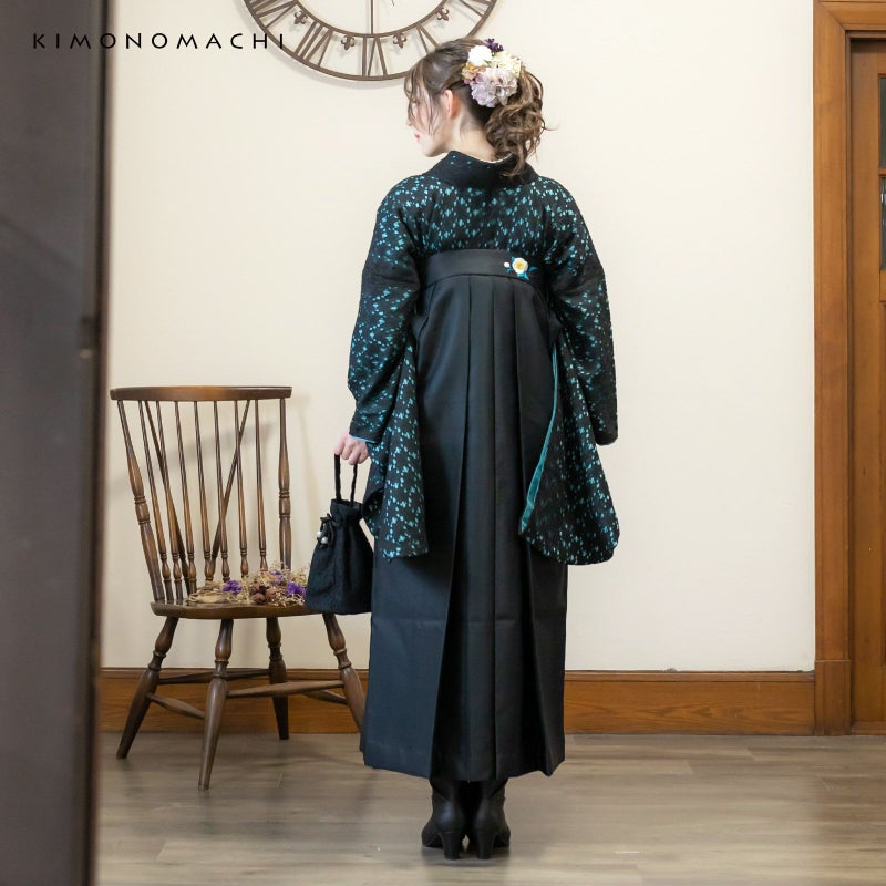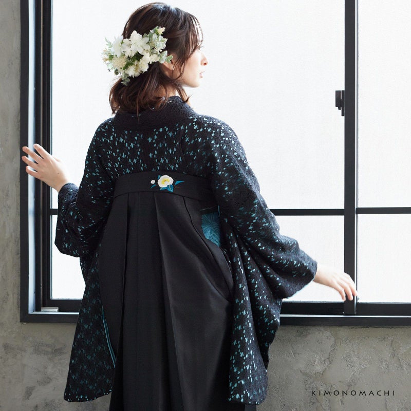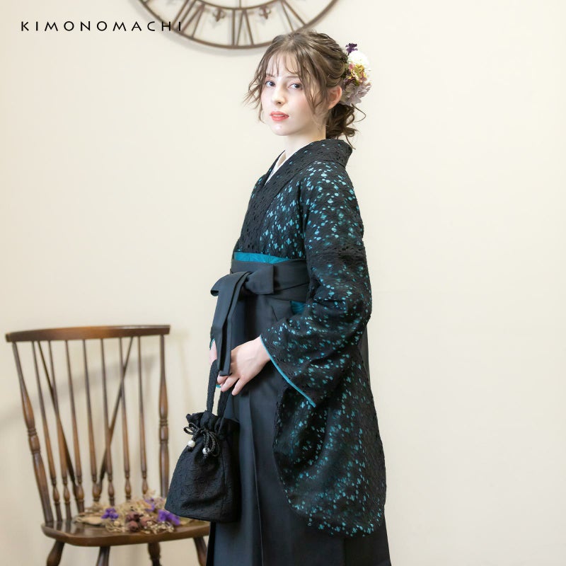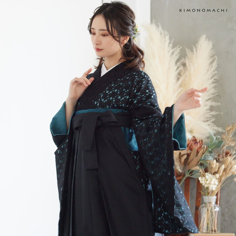 5. (卒業式駆け込みSALE3/19迄)レース 二尺袖着物 単品 「ブラック×ターコイズ」 お仕立て上がり KIMONOMACHI オリジナル レディース レース二尺着物 二尺袖 袴に合わせて 卒業式 謝恩会に ショート丈 京都きもの町オリジナル 【メール便不可】ss2412kck20