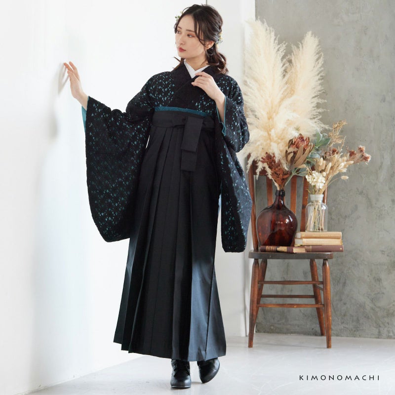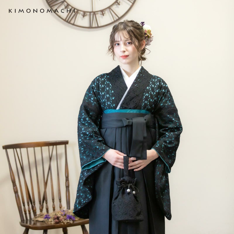 KIMONOMACHIオリジナルのレース二尺袖きもの単品 (卒業式駆け込みSALE3/19迄)レース 二尺袖着物 単品 「ブラック×ターコイズ」 お仕立て上がり KIMONOMACHI オリジナル レディース レース二尺着物 二尺袖 袴に合わせて 卒業式 謝恩会に ショート丈 京都きもの町オリジナル 【メール便不可】ss2412kck20