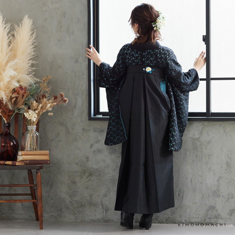袖が長く、華やかな雰囲気です。着物の丈は、袴が着付けやすいように、短い丈になっています。