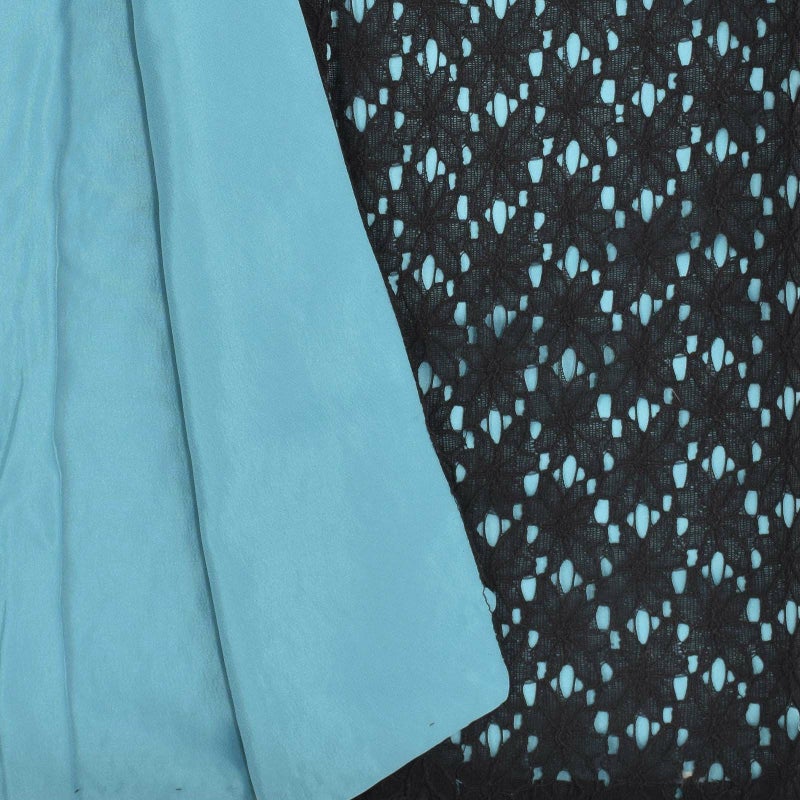 黒のエレガントなフラワーレースにターコイズブルーの色裏地を重ねた配色。色の対比がレースの優美さに鮮烈な印象を添えています。