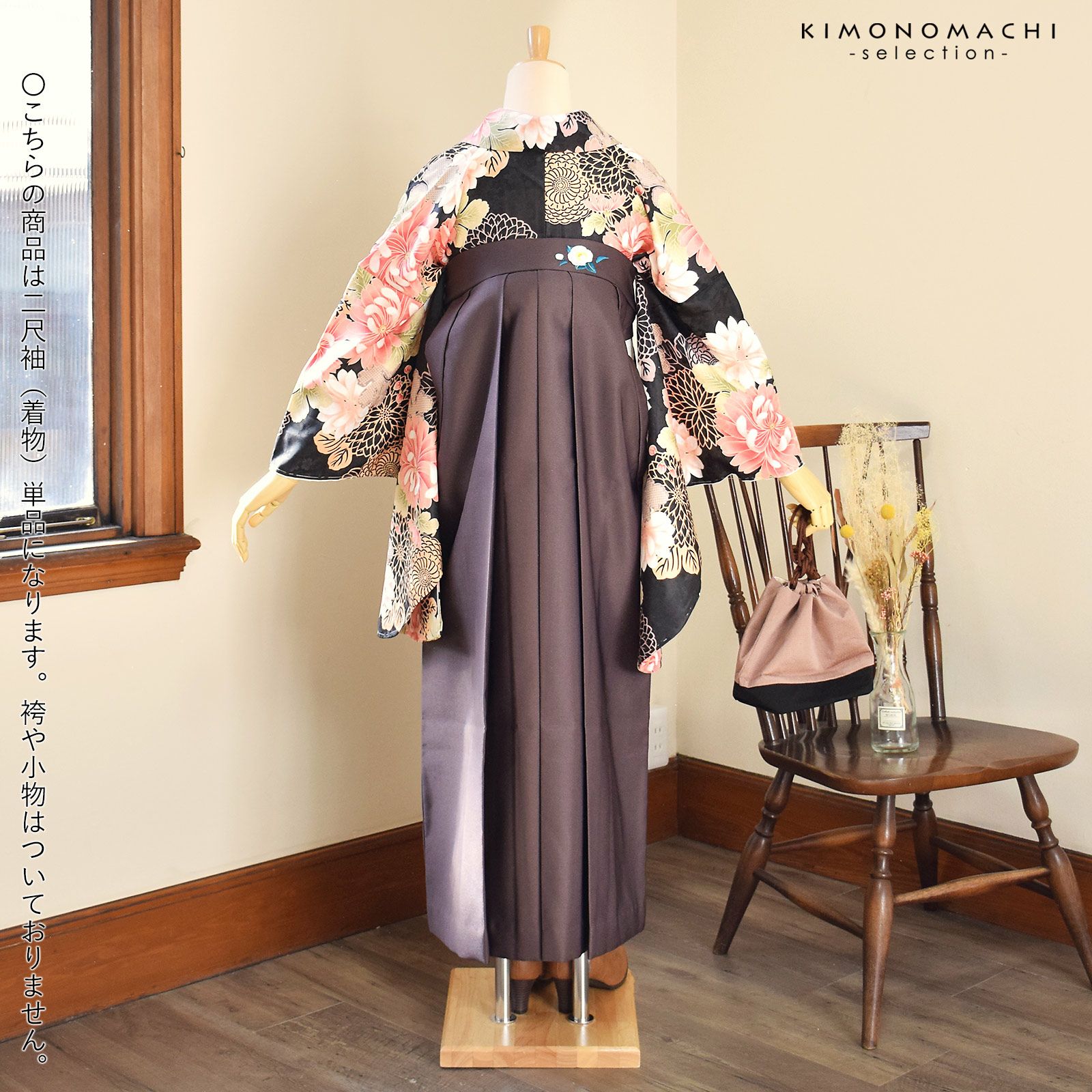 (卒業式応援SALE3/31迄)二尺袖着物 単品 「黒地 菊」 お仕立て上がり レディース 洗える着物 二尺袖 着物 袴に合わせて 卒業式 謝恩会に 通常丈 長着 カジュアル着物 【メール便不可】<H>