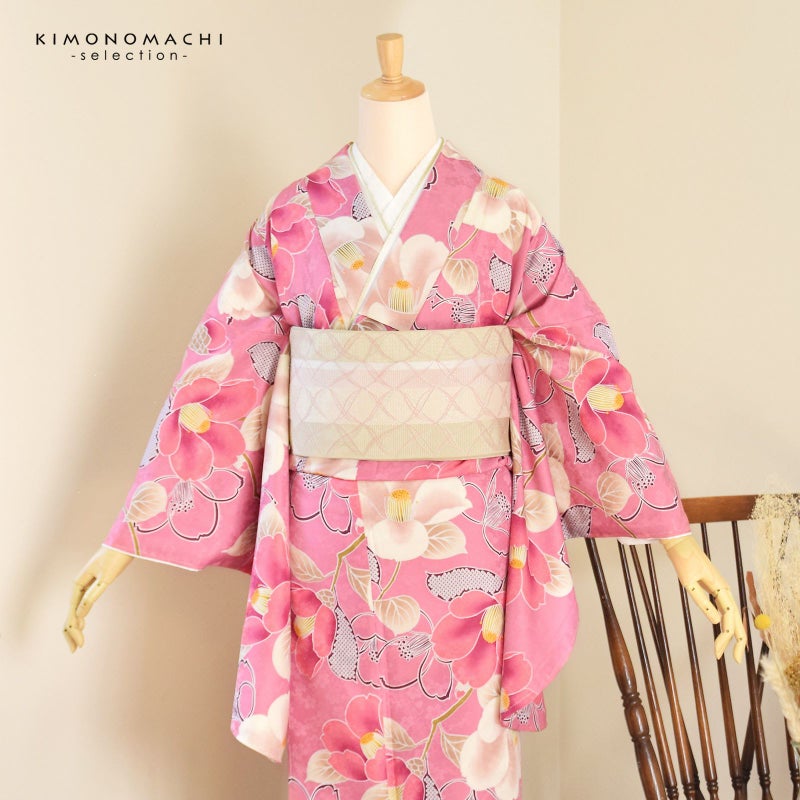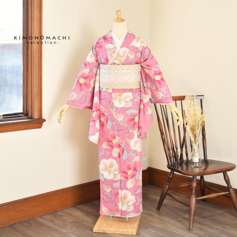 二尺袖着物 単品 「ピンク地 椿」 お仕立て上がり レディース 洗える着物 二尺袖 着物 袴に合わせて 卒業式 謝恩会に 通常丈 長着 カジュアル着物
