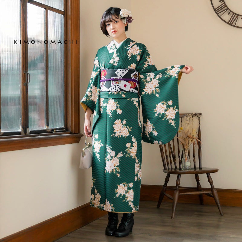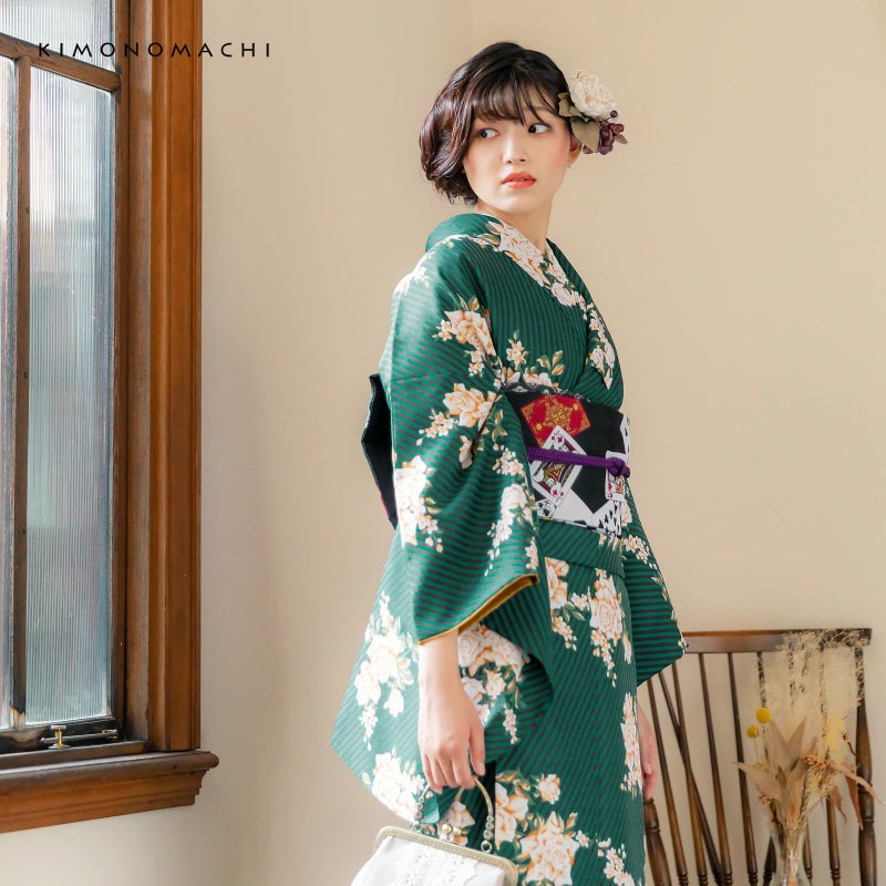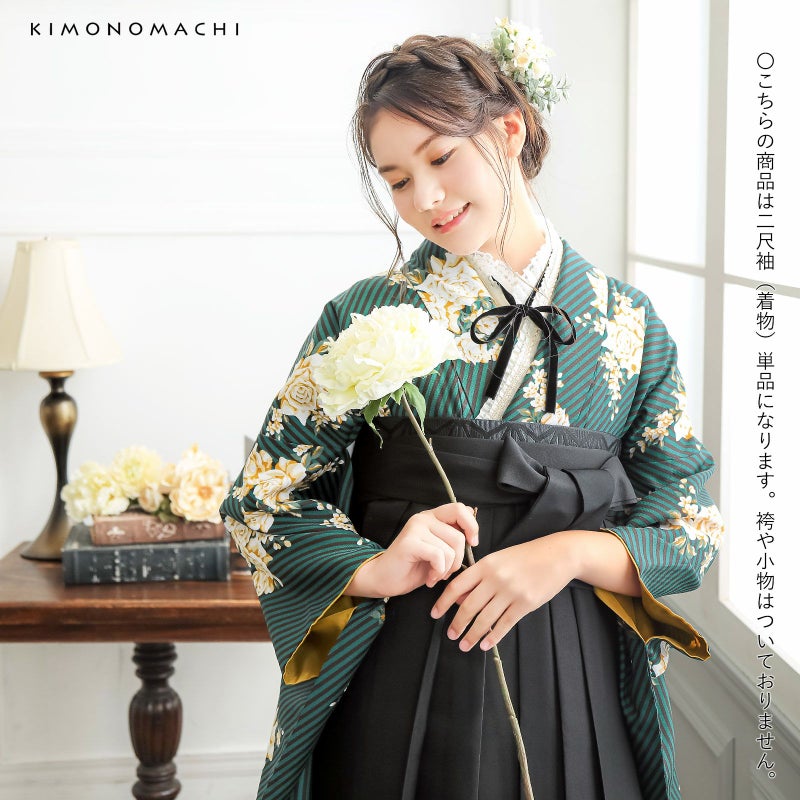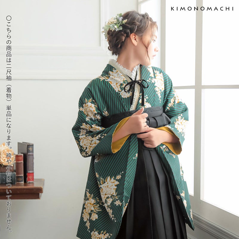 二尺袖着物 単品「ストライプブーケグリーン」KIMONOMACHIオリジナル お仕立て上がり レディース 洗える着物 二尺袖 着物 袴に合わせて 卒業式 謝恩会に 通常丈 長着 カジュアル着物