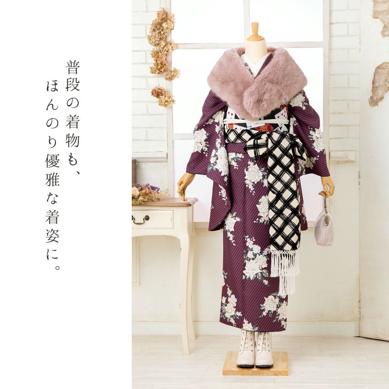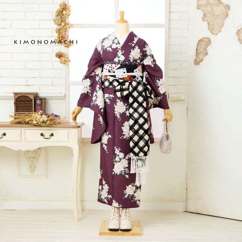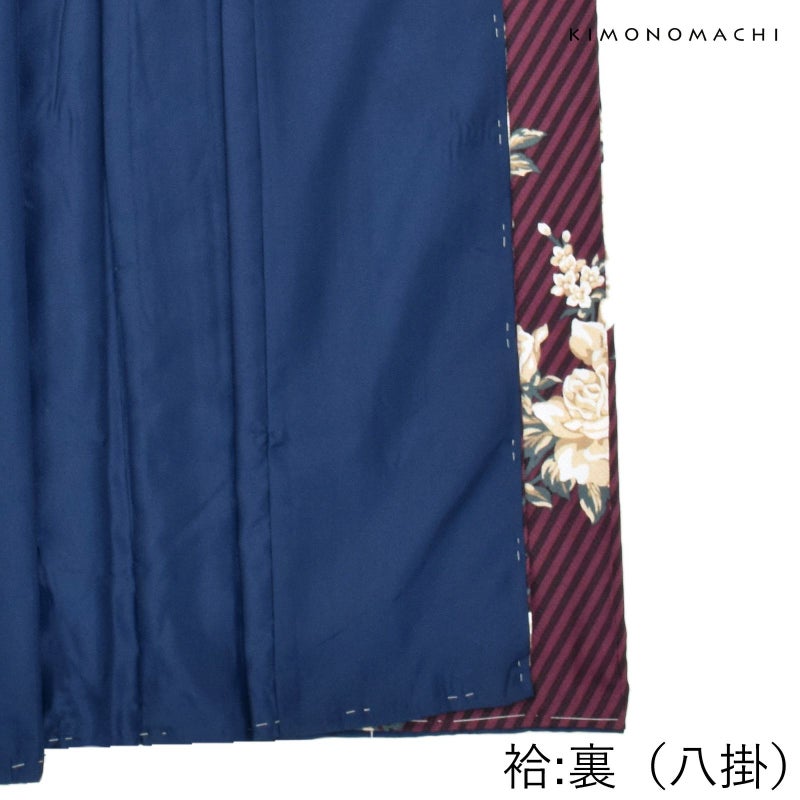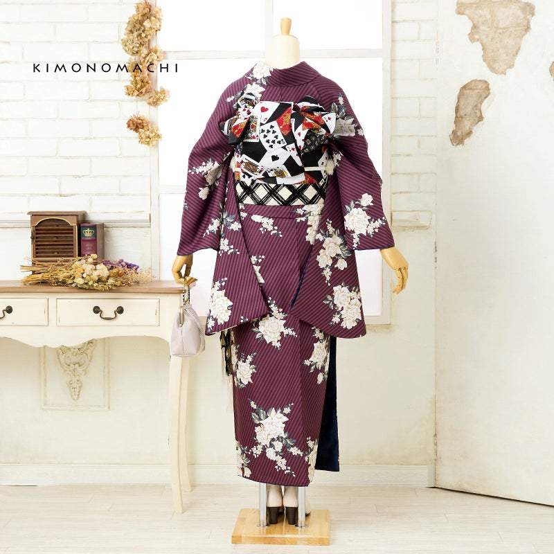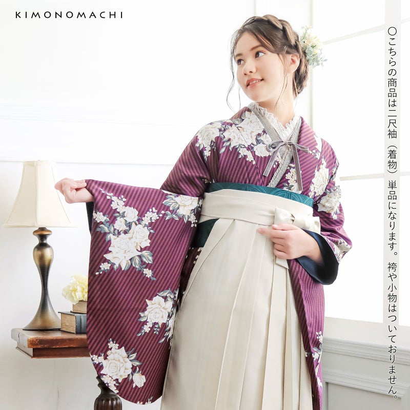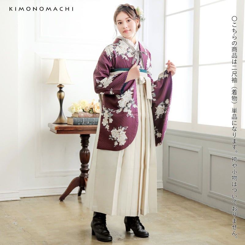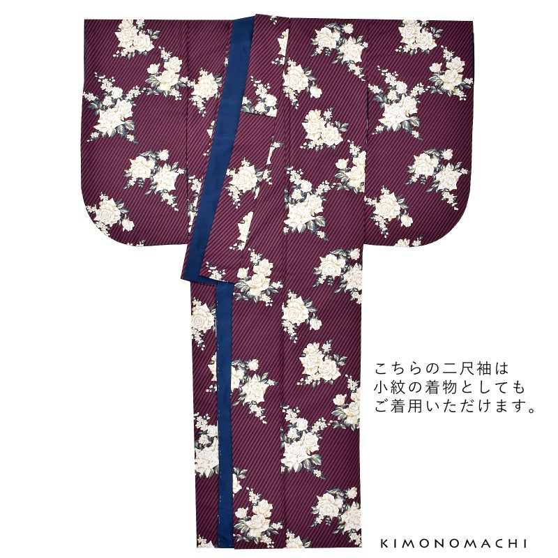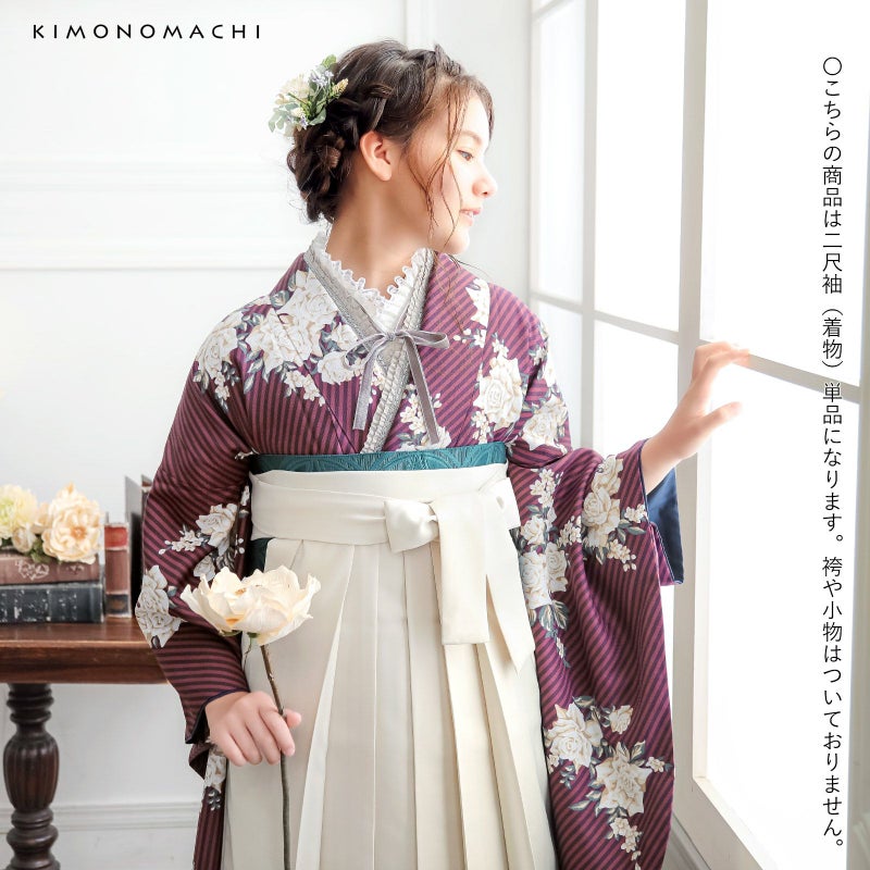 二尺袖着物 単品「ストライプブーケプラム」KIMONOMACHIオリジナル お仕立て上がり レディース 洗える着物 二尺袖 着物 袴に合わせて 卒業式 謝恩会に 通常丈 長着 カジュアル着物【メール便不可】