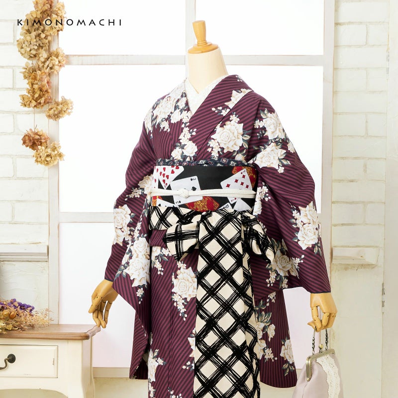 KIMONOMACHI オリジナル! 個性派洗える二尺袖着物 レトロモダン 古典柄 アンティーク着物風 (卒業式応援75%SALE 3/5迄)二尺袖着物 単品「ストライプブーケプラム」KIMONOMACHIオリジナル お仕立て上がり レディース 洗える着物 二尺袖 着物 袴に合わせて 卒業式 謝恩会に 通常丈 長着 カジュアル着物【メール便不可】ss2506kmn10