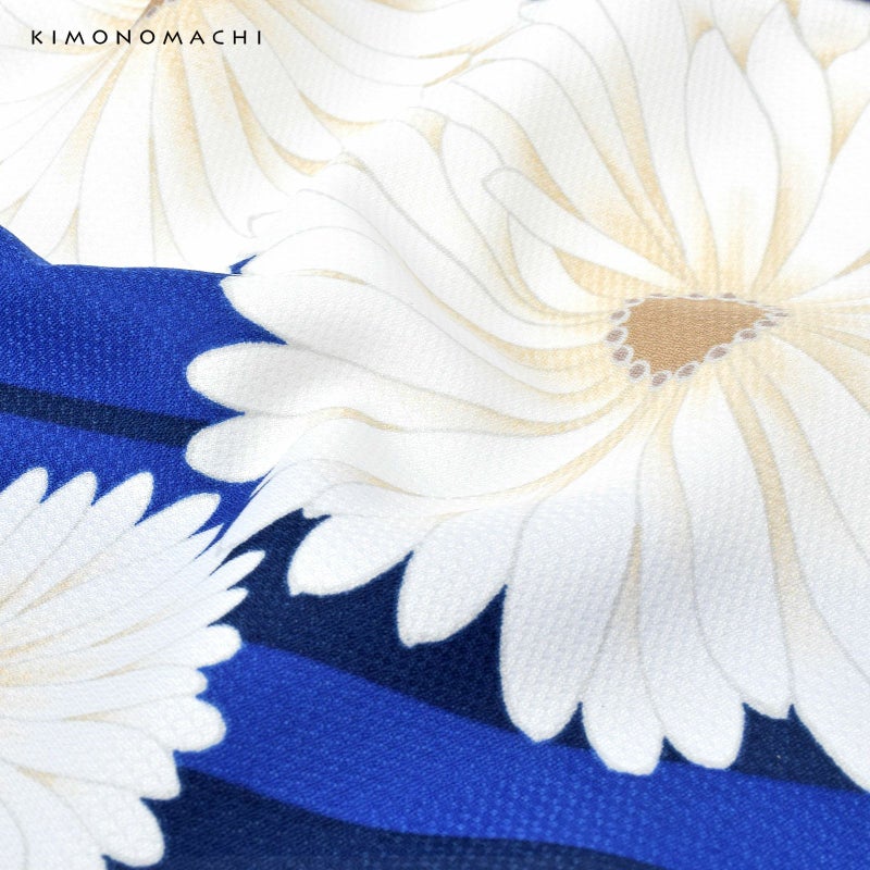 細かな地模様のある生地。あざやかな青の地に紺の矢羽根、白に淡いベージュのぼかしの大小の菊の花。ハッキリと冴えた色合いとアンティーク調の大胆な柄行が魅力です。裏地はオフホワイト。