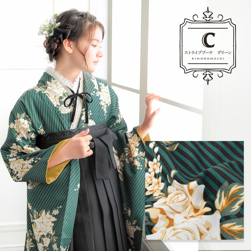 C.ストライプブーケグリーン…細かな地模様のある生地。青みの深緑に黒の斜めストライプの地、白にベージュ、キャメルのバラのブーケが飛び柄で表現されたスタイリッシュなデザイン。裏地は山吹茶。