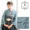 E.アラベスクブルーグレー…細かな地模様のある生地。青緑みのグレーの地にグレイッシュな水色のアラベスク文様。菱形の唐花に立涌状に伸びる蔓草文様とターコイズ系のブルーグレーが、オリエンタルな優美さを感じさせるデザインです。裏地はグレー。