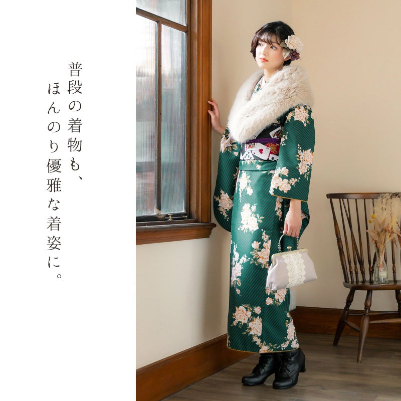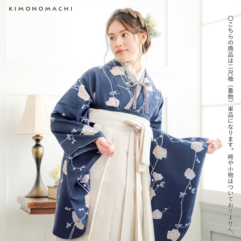 京都きもの町オリジナルブランド「KIMONOMACHI」の二尺袖着物単品です。袴と合わせて卒業式などの袴スタイルに。また身丈が通常の着物と同様の長さがございますので、袴無しで、袖が長めなアンティーク風着物としてもお召しいただけます。