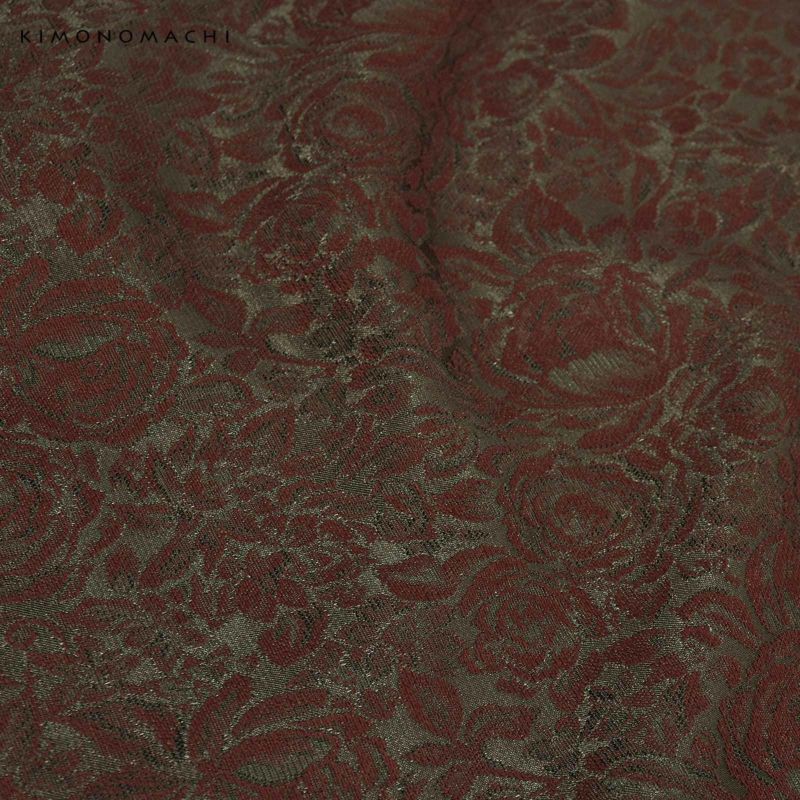 【色柄】光沢のあるチャコールグレーにワインカラーの薔薇があしらわれたシックなお着物。ジャガード織りのため柄が立体的に浮かび上がり、見る角度によって色合い・風合いが変わります。