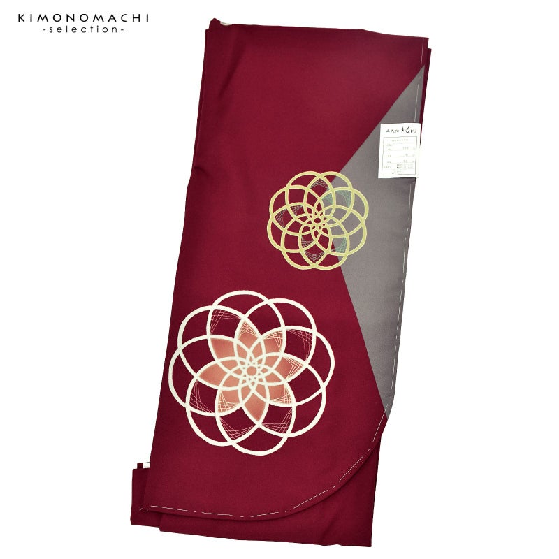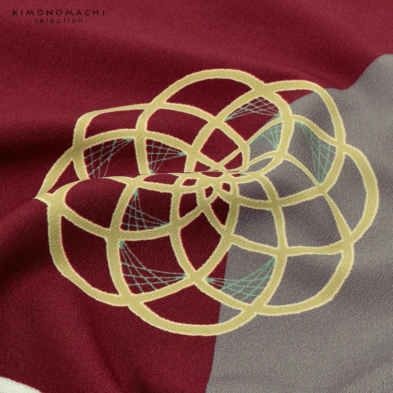 深い臙脂色の地、袖にベージュグレーの切り嵌めのような三角形。淡いベージュ、深い赤紫のラインで構成された大小の輪繋ぎの花の中に、杏色や薄緑色、からし色の挿し色。水引の梅結びのような個性的で可愛らしいデザインです。